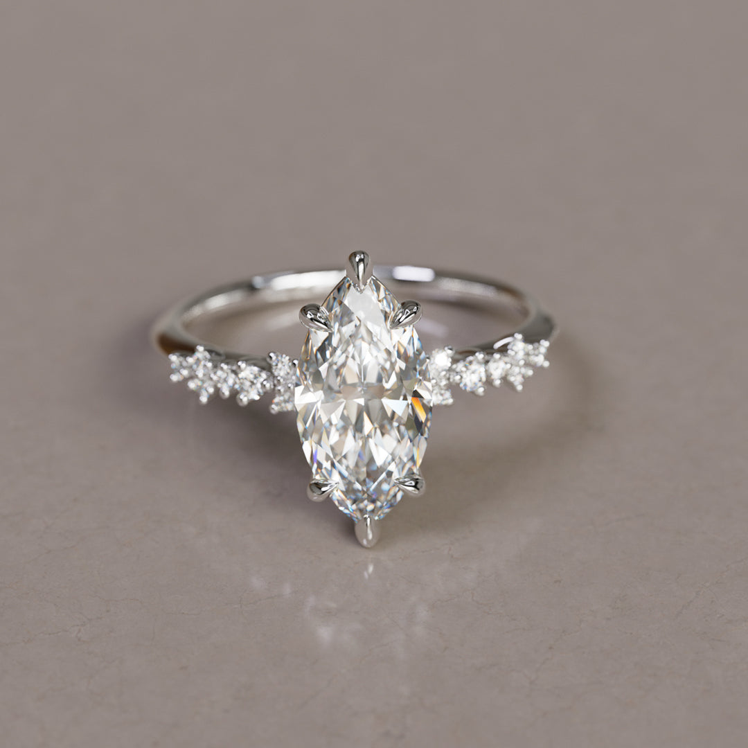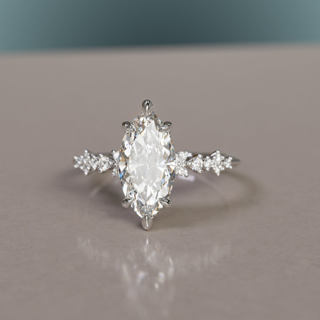 Пръстенът с диамант Astrid е небесен стилен пръстен, който има централен маркизов диамант, акцентиран с клъстери от звездоподобни малки диаманти. Този уникален пръстен би бил перфектната алтернатива на годежен пръстен. SДиамантите ide са 1 мм и 1,5 мм G+ VS1+.