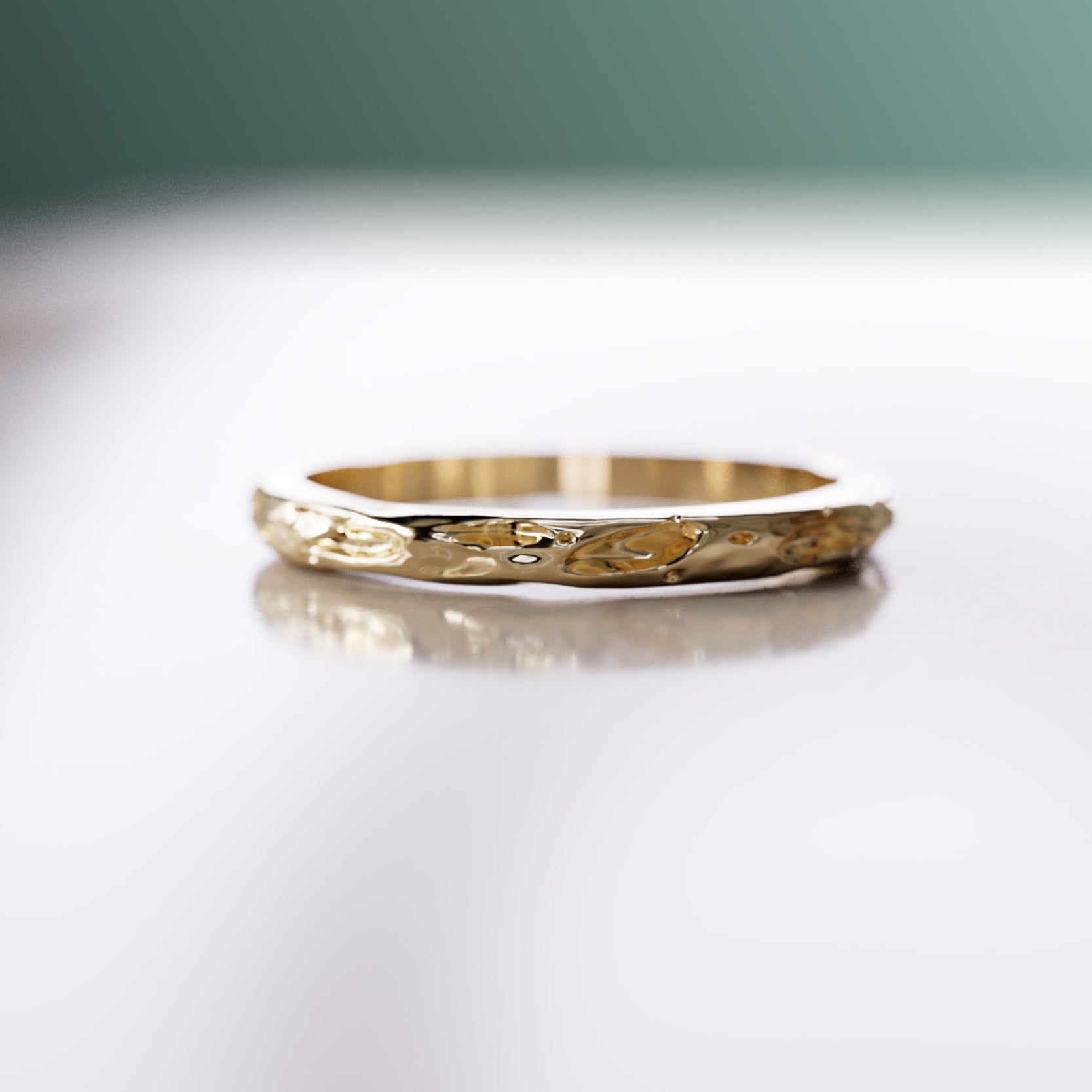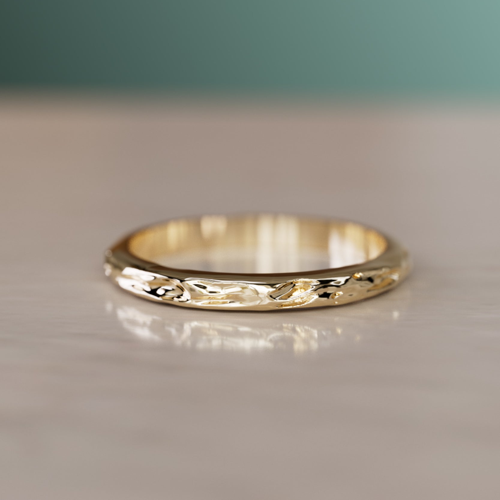 Тесен ръчно изсечен пръстен Rio с вдъхновение от природата, разтопена текстура, 2 мм ширина