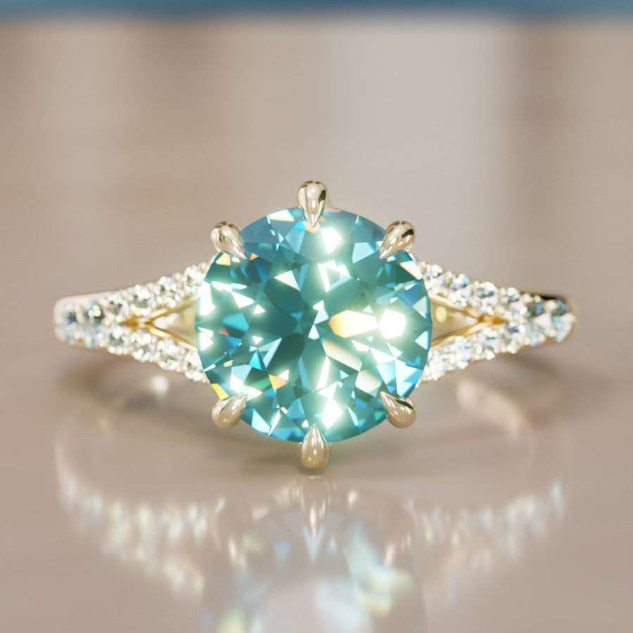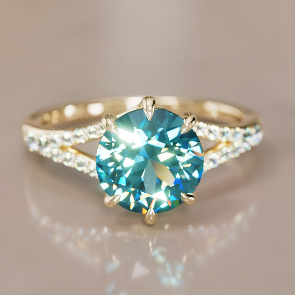 Anell de compromís Amaya rodó blau safir modern únic amb branqueta partida