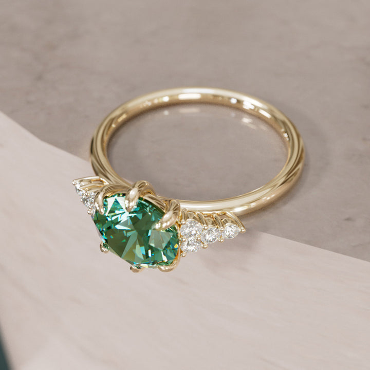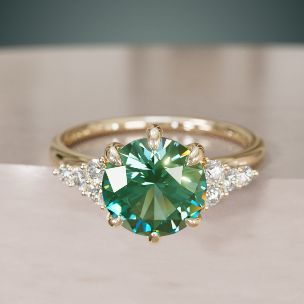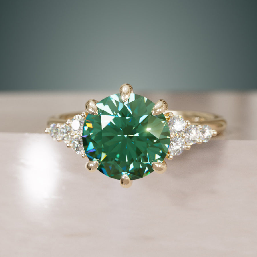 L'anell de compromís Iris és un disseny elegant inspirat en la natura amb grups esfilagarsats de diamants laterals. Aquest anell de compromís rodó presenta un safir verd tall rodó ètic al centre amb muntures de punxa i bells diamants de laboratori d'accent que creen una silueta única i afalagadora. Els diamants rodons laterals de laboratori sumen un total de 0,20 quirats.