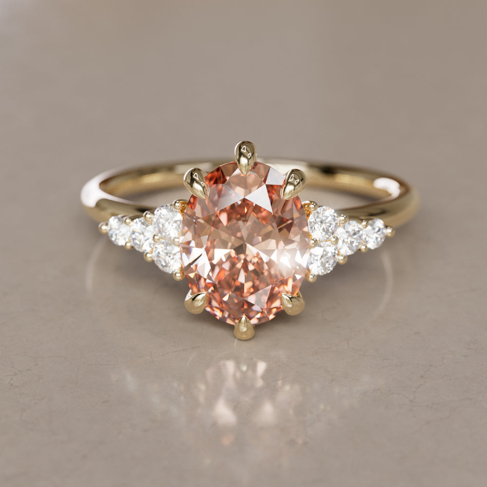 Diamant de laboratori central en l'exemple de 1,5 cts i el color exacte de préssec es personalitzarà per a vostè. Certificat GIA, IGI o GCAL. Els diamants de laboratori rodons laterals són un total de 0,20 cts. Obtenim els nostres diamants de laboratori centrals de Diamant de laboratori de captura de carboni fet de la contaminació de l'aire i de diamants de laboratori amb qualificació sostenible SCS.