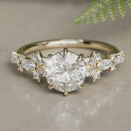 El diamant de laboratori tall rodó al centre de l'anell Philomena està accentuat per una cascada única de diamants de laboratori baguette esmolats i diamants de laboratori marquís. Aquest anell de compromís modern és l'epítom de el romanticisme amb el seu brillantor hipnotitzant i la seva silueta inspirada en la natura. Els diamants de laboratori laterals sumen un total de 0,43 ct.