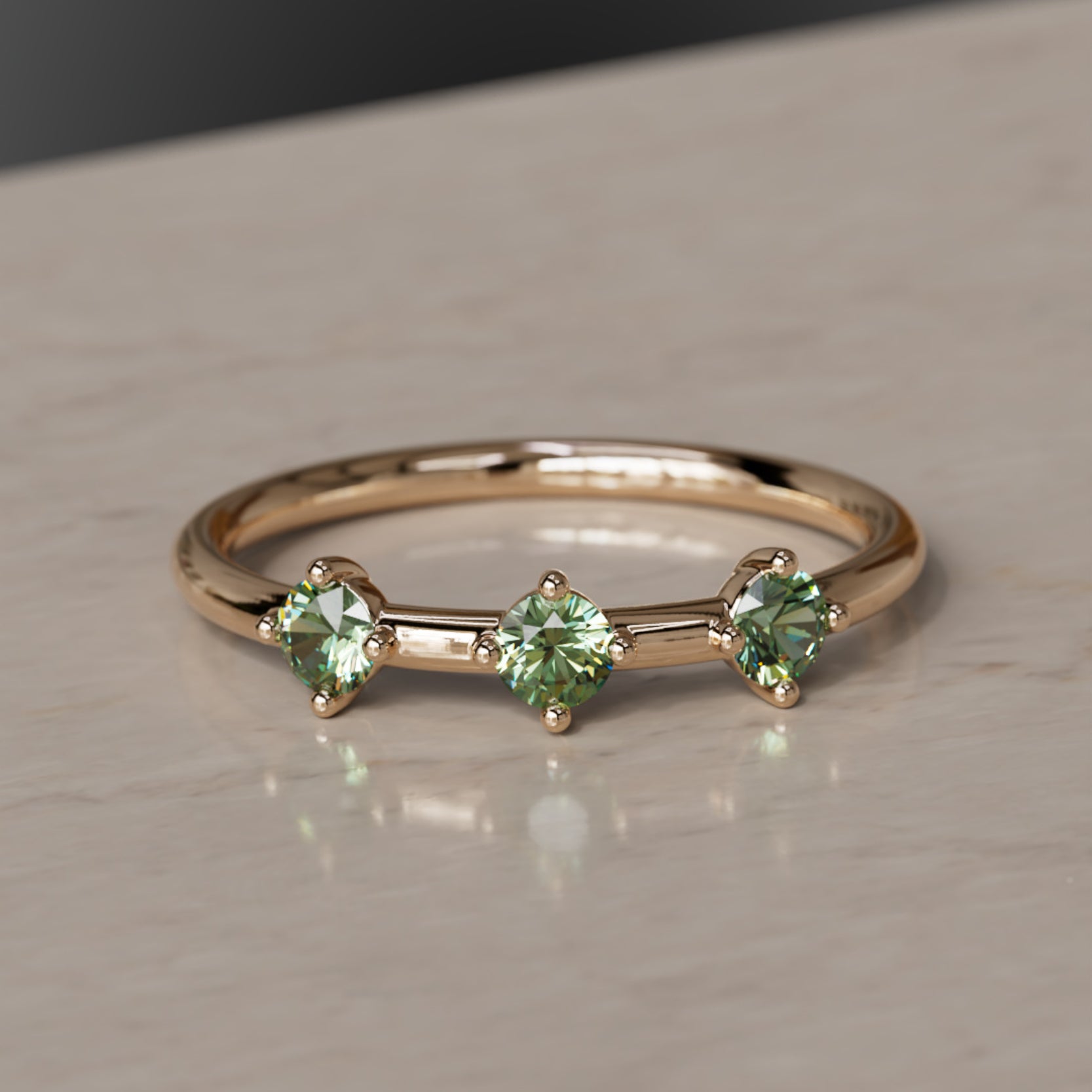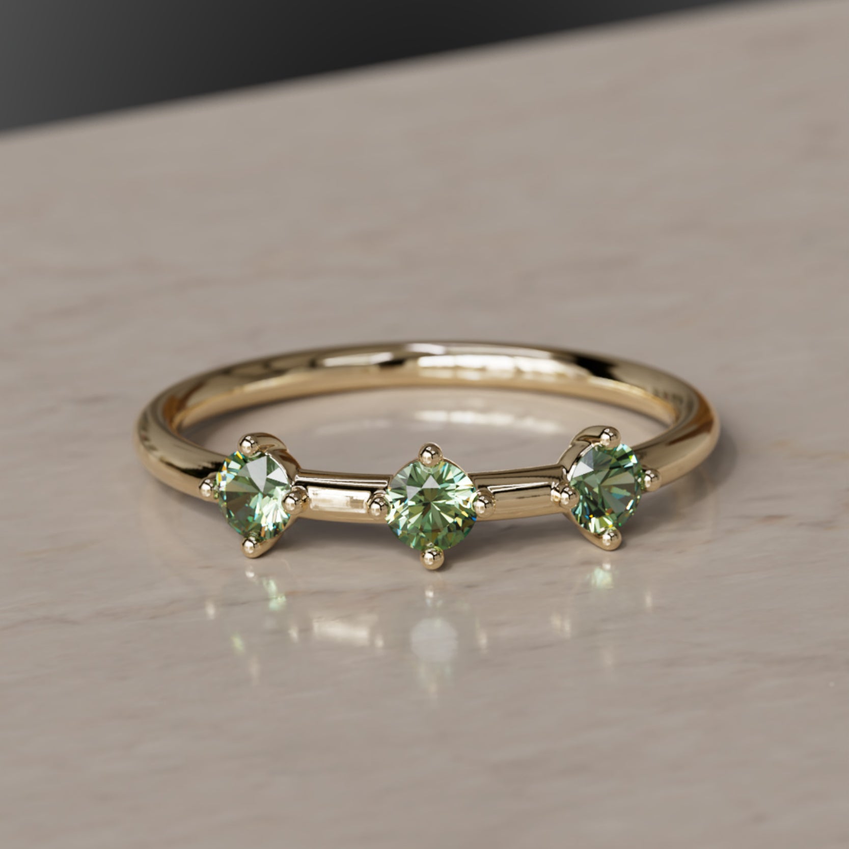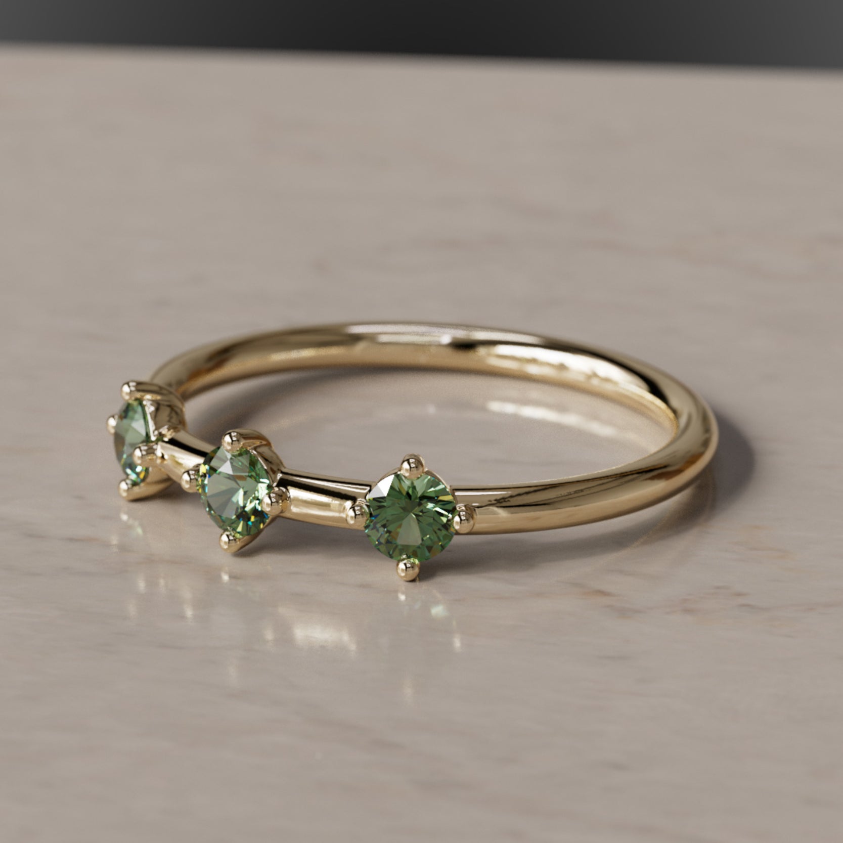 La constel·lació d’Orion el Caçador és una de les disposicions d’estrelles més distintives al cel nocturn. Les tres belles estrelles que delimiten el cinturó del Caçador van ser la inspiració per a l’Anell del Cinturó d’Orion. Safirs verds d’alta qualitat i d’origen ètic estan incrustats en or satinat per donar a aquest anell un aspecte romàntic. Porta l’Anell del Cinturó d’Orion per simbolitzar un canvi còsmic a la teva vida. Es combina perfectament amb l’Anell apilable Ulla i l’Anell apilable Milky Way. Anell fet en or groc, or rosa o or blanc fairmined sòlid i amb un pes total de 0,30 quirats.