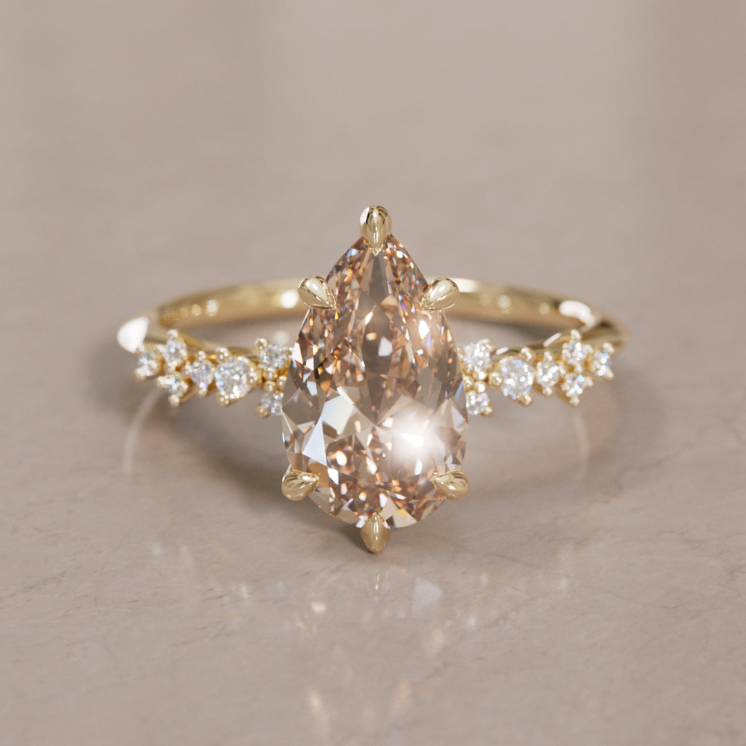 L'anell de diamant Astrid és un anell d'estil celestial que presenta un diamant de xampany pera al centre, accentuat per grups de petits diamants en forma d'estrella. Aquest anell únic seria l'alternativa perfecta com a anell de compromís. Els diamants laterals són de 1 mm i 1,5 mm G+ VS1+.