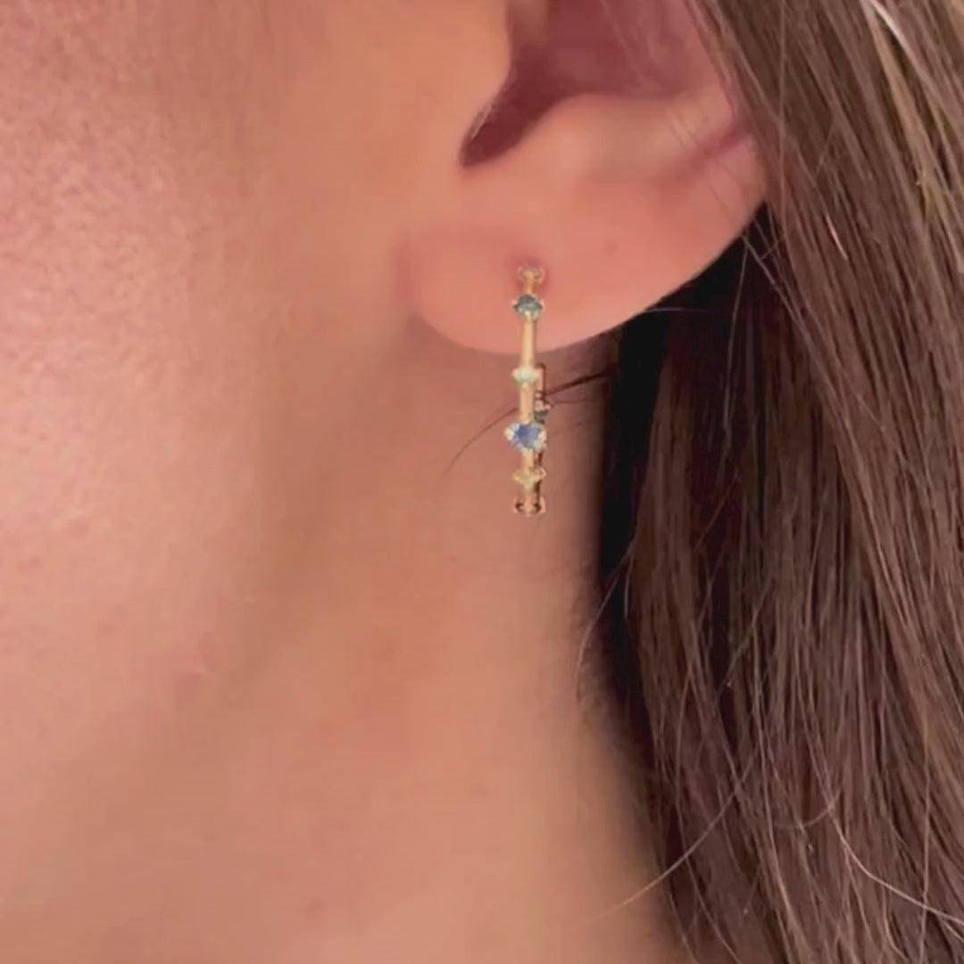 Inspired by perfectly imperfect celestial patterns, the Galaxy Hoops are your new go-to staple that adds unique cosmic sparkle to your look. These hoops feature blue and teal sapphires and sky blue aquamarines in an Ombré pattern scattered along the perimeter and also inside the hoops so that you shine from every angle. Size: 16mm wide hoop. Backing: Secures on your ears with posts and butterfly backs. Features .03cts aquamarines, .06cts teal sapphires and .015cts sized blue sapphires with a total .42Cts. Stones are ethically sourced.