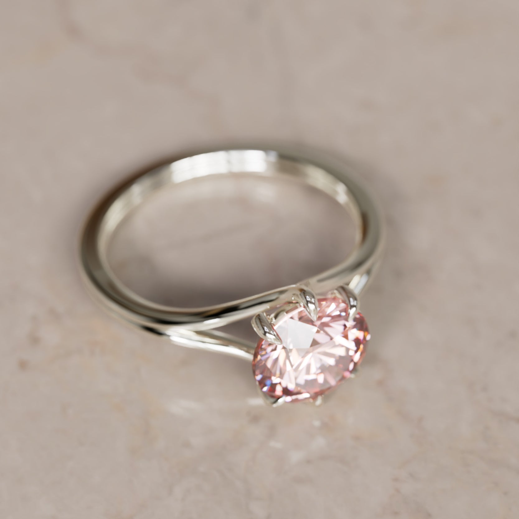 As if forged in the realm of the Elves the Mira Round cut engagement ring radiates with magic and uniqueness. This engagement ring's sleek split shank creates a floating diamond effect that will beam light from across the room. A center brilliant cut pink lab diamond is securely set with six elegant prongs. The band is crafted from 14k fairmined gold and has a width of 1.7mm at the bottom.