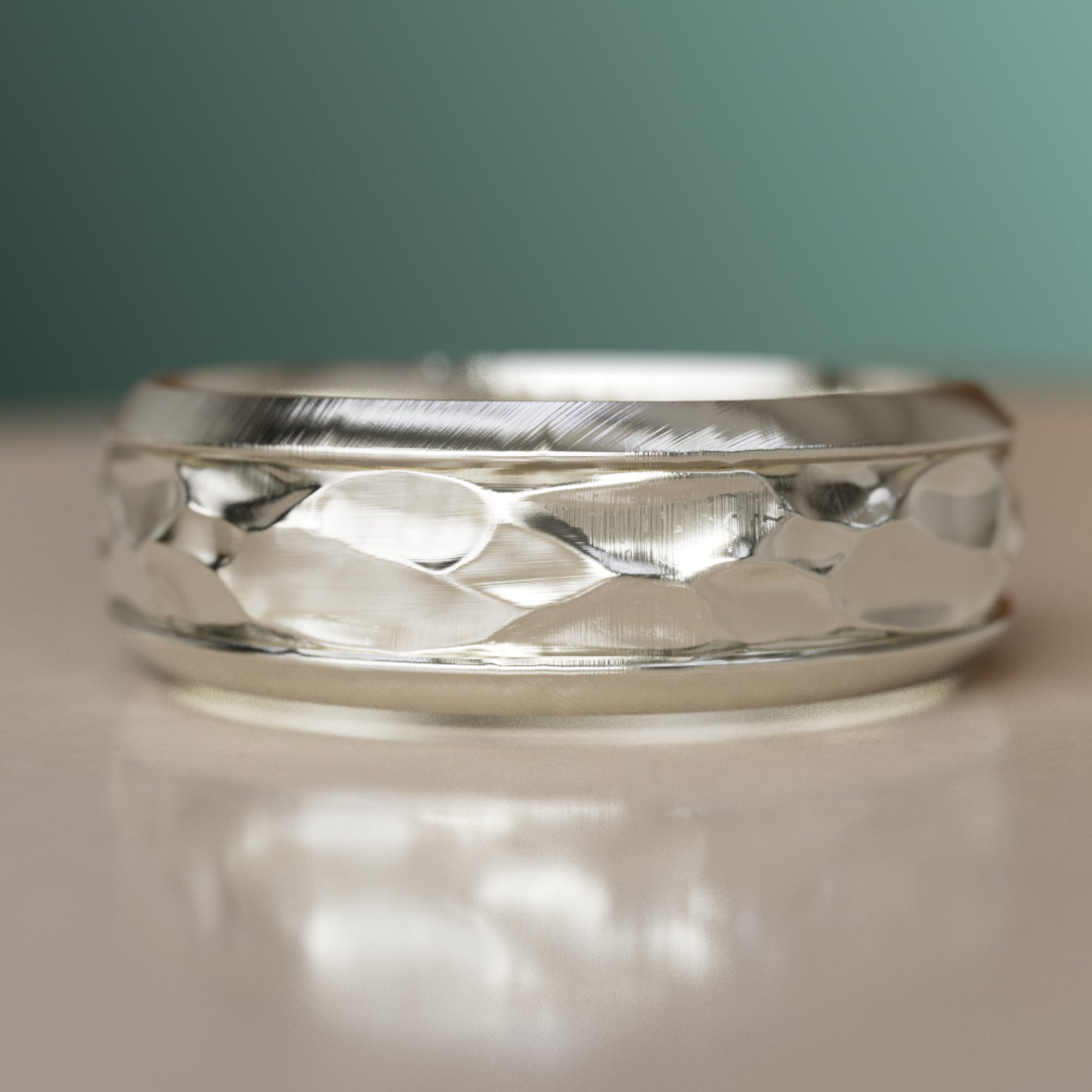 The Marcus ring is unique men's wedding band featuring a middle channel of textured gold inspired by rocks and landscapes. This weighty ring has beveled channeled edging for a comfortable and classic look.