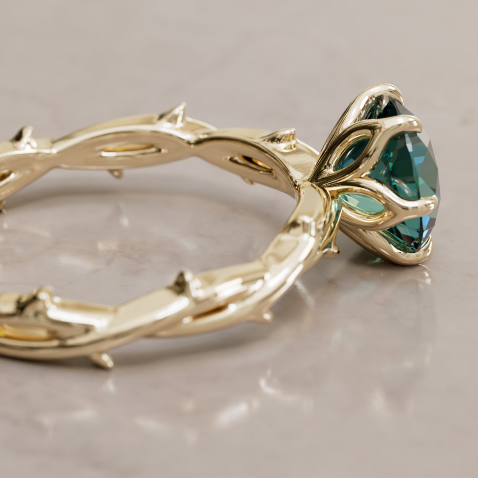 This unique engagement ring takes inspiration from the pages of our favorite fantasy books. The Ferelith Ring band is reminiscent of an elven crown with braided branches and beautiful thorns. The unique petal prong setting adds an enchanting touch to the center round cut teal sapphire.