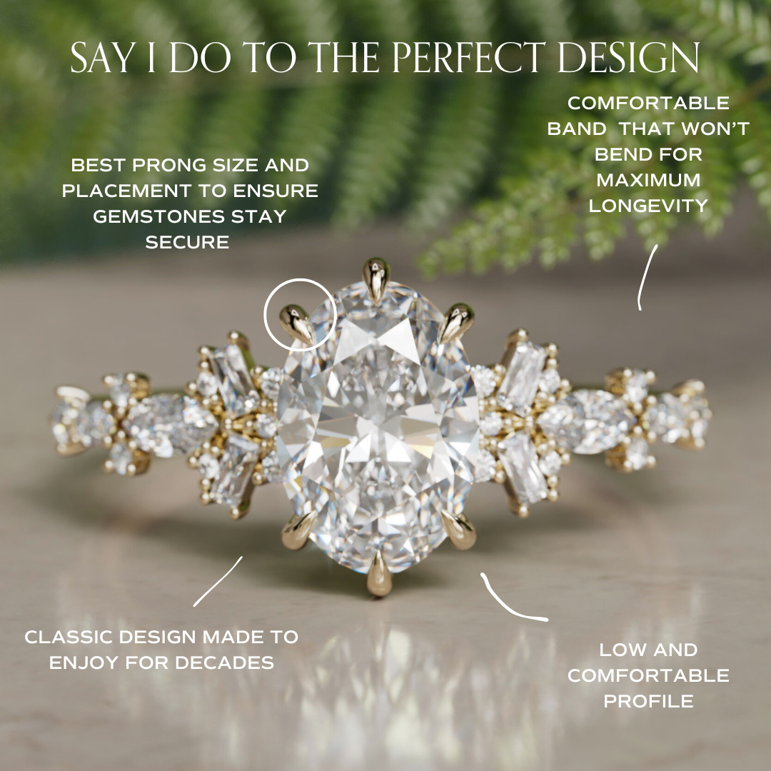 The Philomena ring's center oval cut lab diamond is accented by a unique cascade of tapered baguette lab diamonds and marquise lab diamonds. This modern engagement ring is the epitome of romance with it's mesmerizing sparkle and nature inspired silhouette.