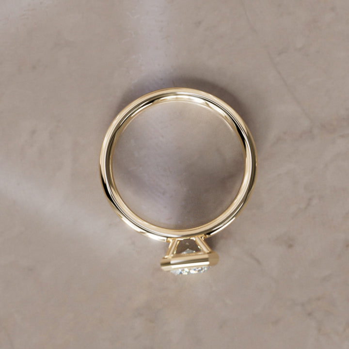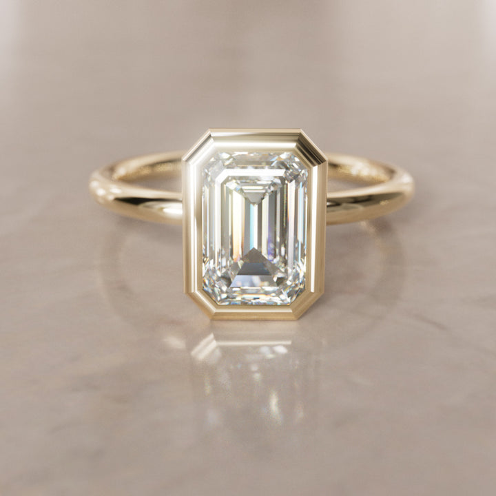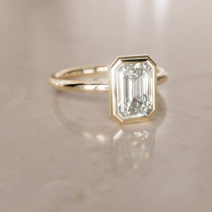 The Lexie diamond engagement ring is a modern solitaire that features a uniquely set emerald cut diamond. Expertly set in a bezel setting, the 14k fairmined gold band has a 1.7mm width. Customize your ring by selecting the perfect stone from our selection of carat sizes.
