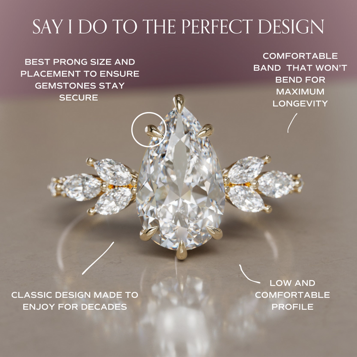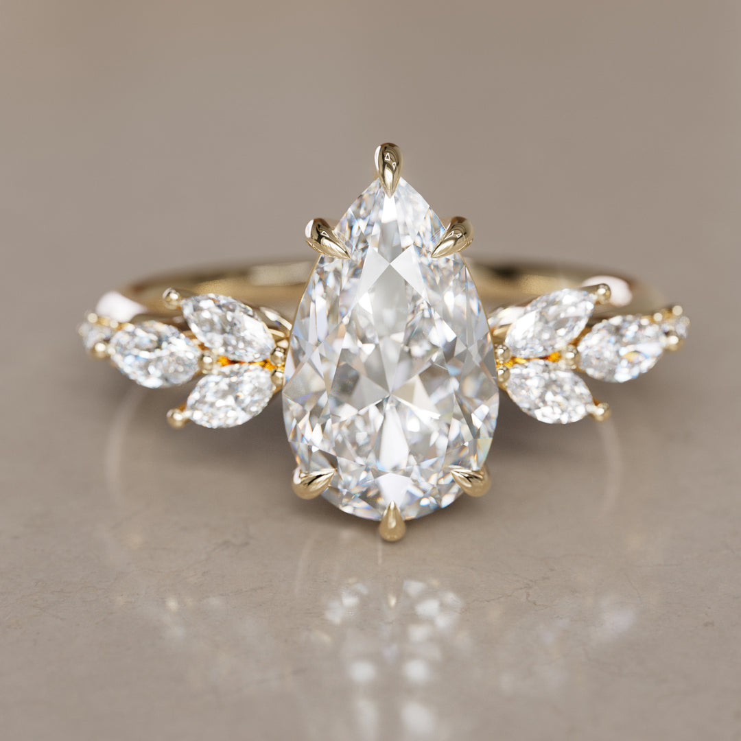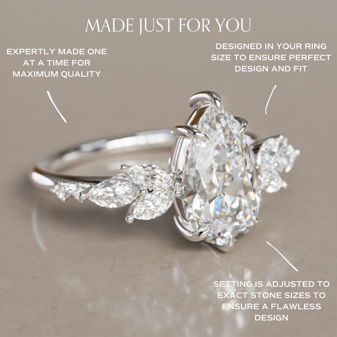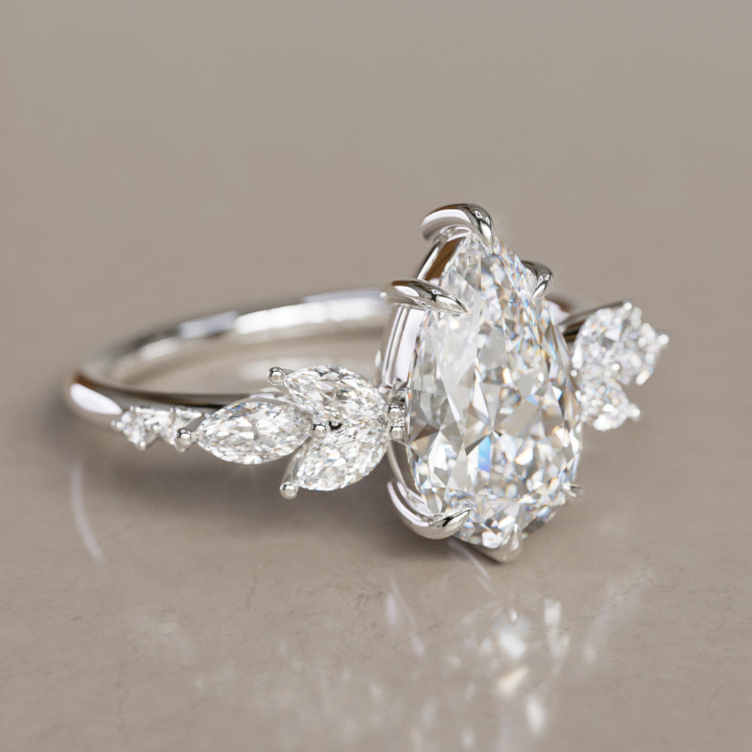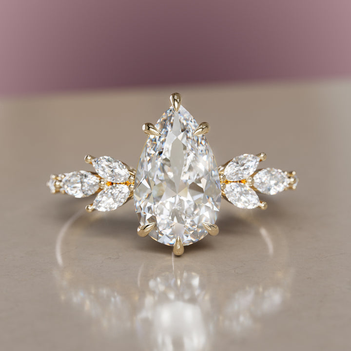 The Lily is a unique ring for hopeless romantics. Inspired by the beauty of flowers a pear diamond takes center stage accented by a blossom of marquise diamonds. The Lily makes the perfect nature inspired engagement ring for those that feel connected to mother earth. Side lab diamonds are .39 ct total.