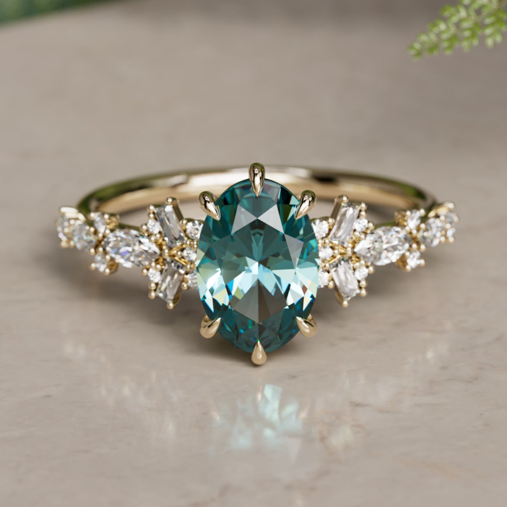The Philomena ring's center oval cut teal sapphire is accented by a unique cascade of tapered baguette lab diamonds and marquise lab diamonds. This modern engagement ring is the epitome of romance with it's mesmerizing sparkle and nature inspired silhouette. Side lab diamonds are .43 ct total.