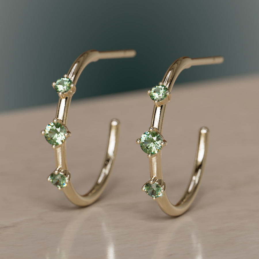 Orion Jægerens stjernebillede er en af de mest markante stjerneformationer på nattehimlen. De tre smukke stjerner, der danner Jægerens bælte, var inspirationen til Orion’s Belt Hoops. Størrelse: 16 mm brede hoops. Lukning: Sidder fast på dine ører med stifter og sommerfugle-lukninger. Den samlede vægt af grønne safirer er 0,24 carat.