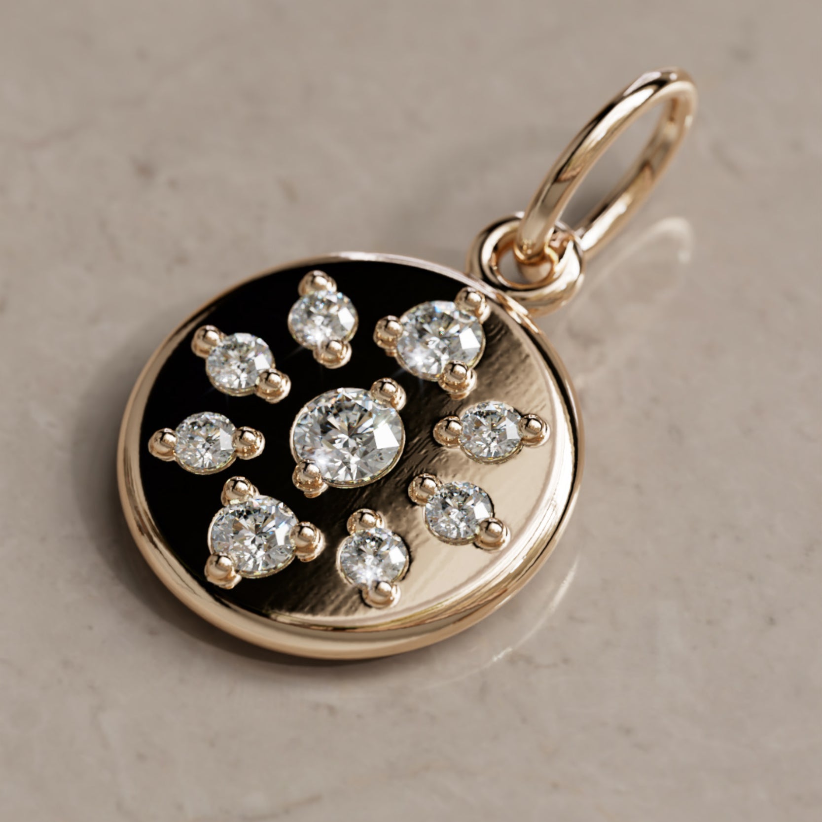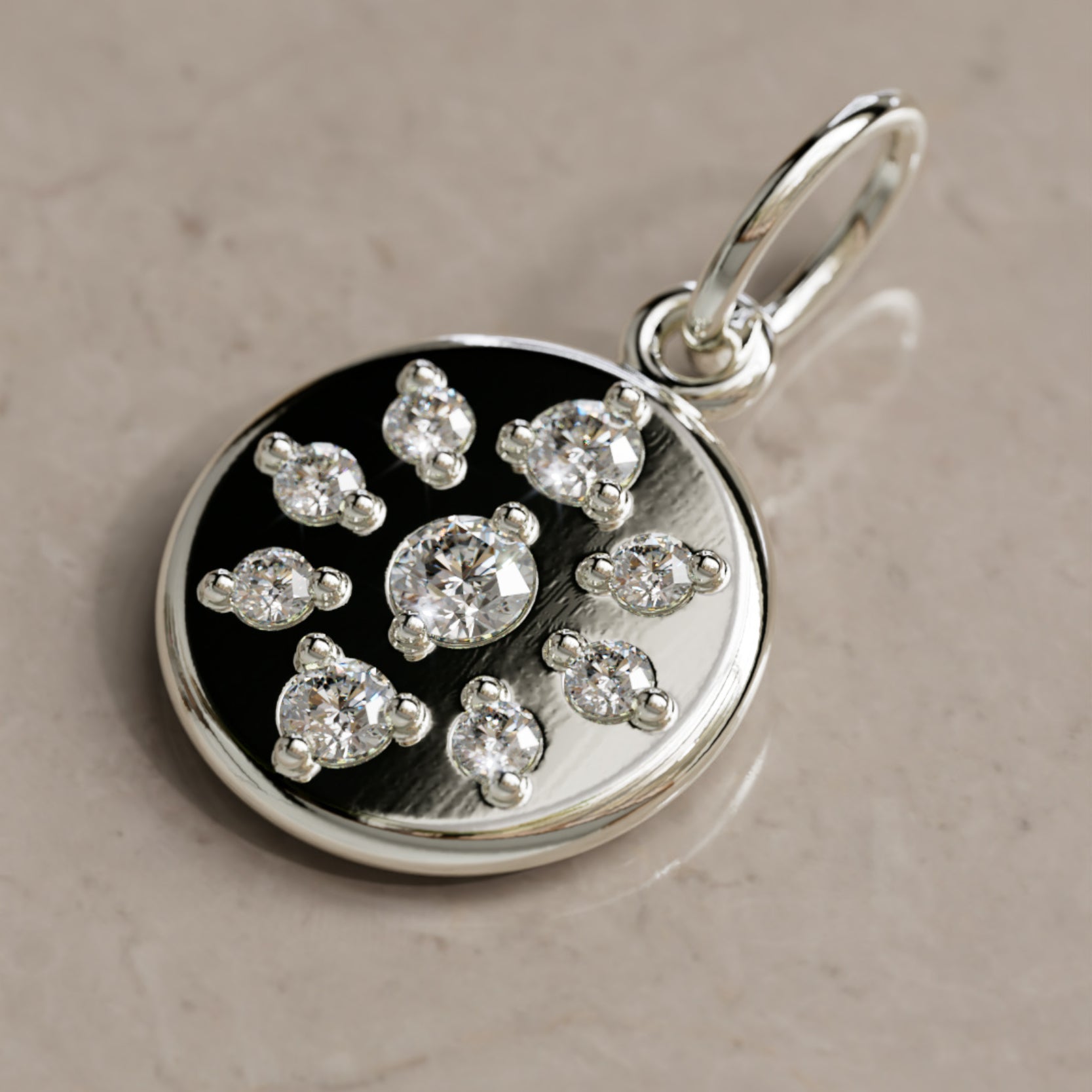 Et klassisk møntvedhæng, der har strålende indlejrede ædelsten. Det minder om gamle begravede skatte og er opkaldt efter Helios, den antikke græske solgud. Helios-halskæden, der repræsenterer livets og lysets centrum, er en kraftfuld talisman, der minder os om vores styrke og magt. Vedhænget måler 14 mm i bredden.