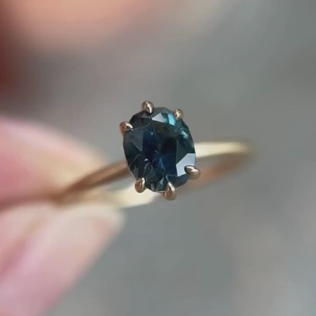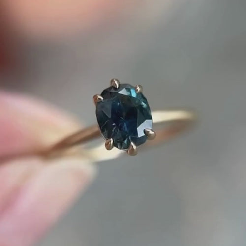 Naiad Solitaire er en minimalistisk ring i et moderne design. En ansvarligt fremskaffet, levende oval-slebet safir er fat i klør for at fremhæve alle stenens farver og givet en satinfinish for at få stenen til at træde frem. De håndhuggede detaljer vækker mindelser om oldgamle skatte. Efter bestilling vil du kunne vælge din præcise sten til en tilpasset ring. Den viste sten er omkring 1 Ct.