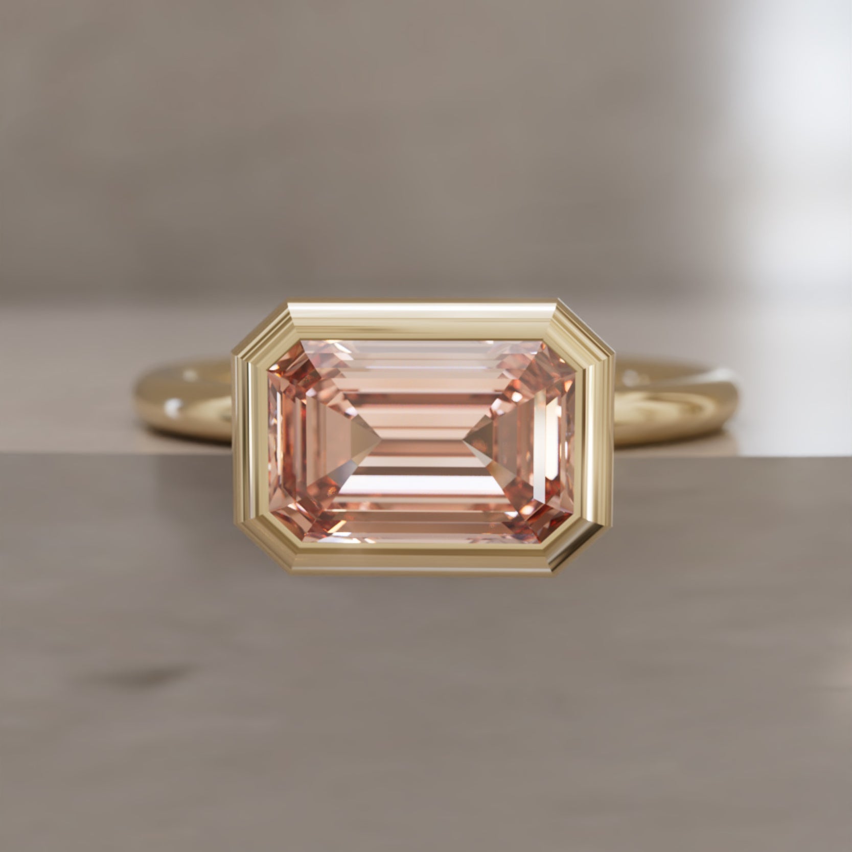 Den unikke Indie diamantforlovelsesring er en moderne solitair, der har en vandret sat smaragdslået champagne fersken diamant. Ekspertindfattet i en bezel-indfatning har 14k fairminet guldbånd en bredde på 1,7 mm. Tilpas din ring ved at vælge den perfekte diamantkaratstørrelse og metalfinish.