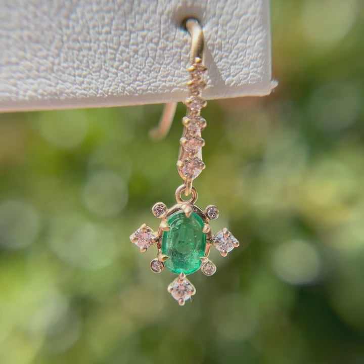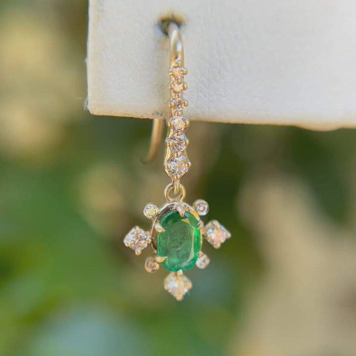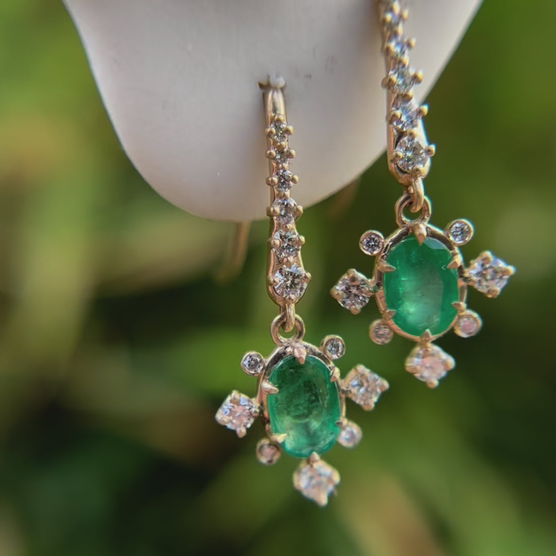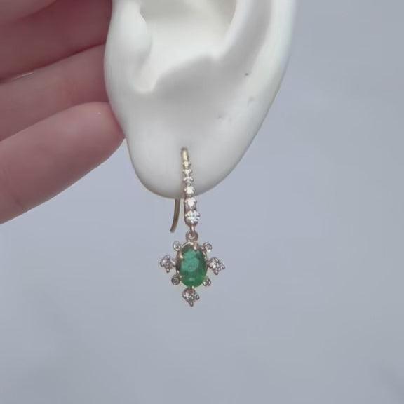 Einzigartige epische Hakenohrringe, die jedem Look die perfekte Menge an Eleganz und Glanz verleihen. Mit atemberaubenden oval geschliffenen grünen Smaragden, einem strahlenden Diamant-Halo und mit Diamanten besetzten Haken über dem Smaragd-Anhänger für perfekte Bewegung. Die Vita-Ohrringe sind garantiert ein Gesprächsstoff und ein geschätztes Erbstück. Smaragde messen 5,8 mm x 4 mm und das Gesamtgewicht der Diamanten beträgt 0,594 Karat.