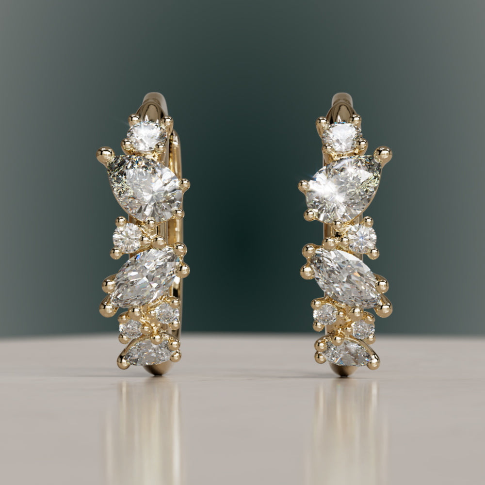 Die Mélange Clicker-Creolen sind ein elegantes Alltags-Basic und zeichnen sich durch ein gemischtes Collage-Design aus Birnen-, Marquise- und Rundschliff-Diamanten aus, die entlang des Randes eines modernen 14-karätigen Gold-Clicker-Creols gefasst sind. Diese Ohrringe schließen mit einem Scharnier-Clicker-Verschluss. Für einen nahtlosen Creolen-Look aus allen Blickwinkeln sind Clicker die einfachsten Ohrringe für den täglichen Gebrauch. Das Gesamtkaratgewicht der Diamanten für das Paar beträgt 0,32 Karat. Das Innere des Creols misst etwa 12 mm für den perfekten Creolen-Look.