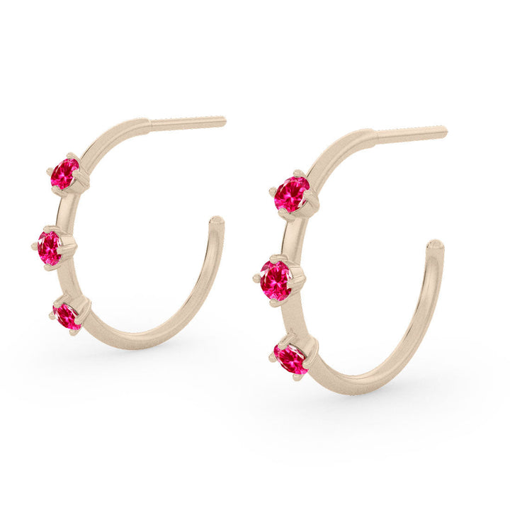 The Eros Hoops features three vibrant rubies are set in sumptuous fairmined gold and finished with 4 rounded prongs. Stones are .24cts total. Ruby is July's birthstone and represents creativity, loyalty, honor and compassion but can be enjoyed by everyone all year long. Gemstones are ethically sourced top-grade AAA Vietnamese rubies with a deep rich fuchsia color. Size: 16mm wide hoop. Backing: Secures on your ears with posts and butterfly backs.