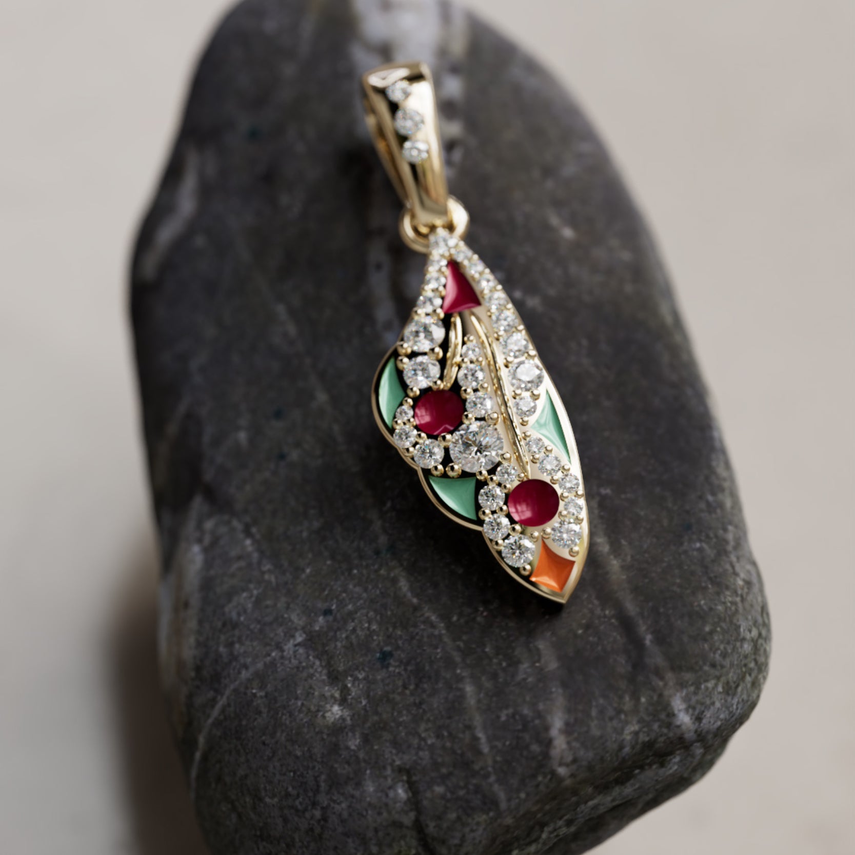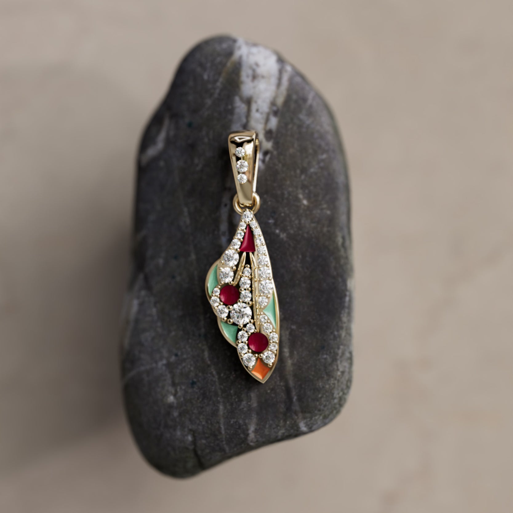 Inspired by the most magical creature of them all, the butterfly represents transformation, hope, and rebirth. Mariposa means butterfly in Spanish, and this pendant makes a stunning gift for yourself or someone you love. The perfect statement piece to mark a milestone and take your unique story with you everywhere you go. In colorway Merlot and Malachite, featuring merlot red, malachite green and manadrin orange. This unique pendant is handmade one at a time with carefully painted enamel, your choice of metal color and lab grown diamonds. Charm is 30mm long with total carat wight is .86cts and total gold weight in 14k is 6 grams. Chain sold separately.