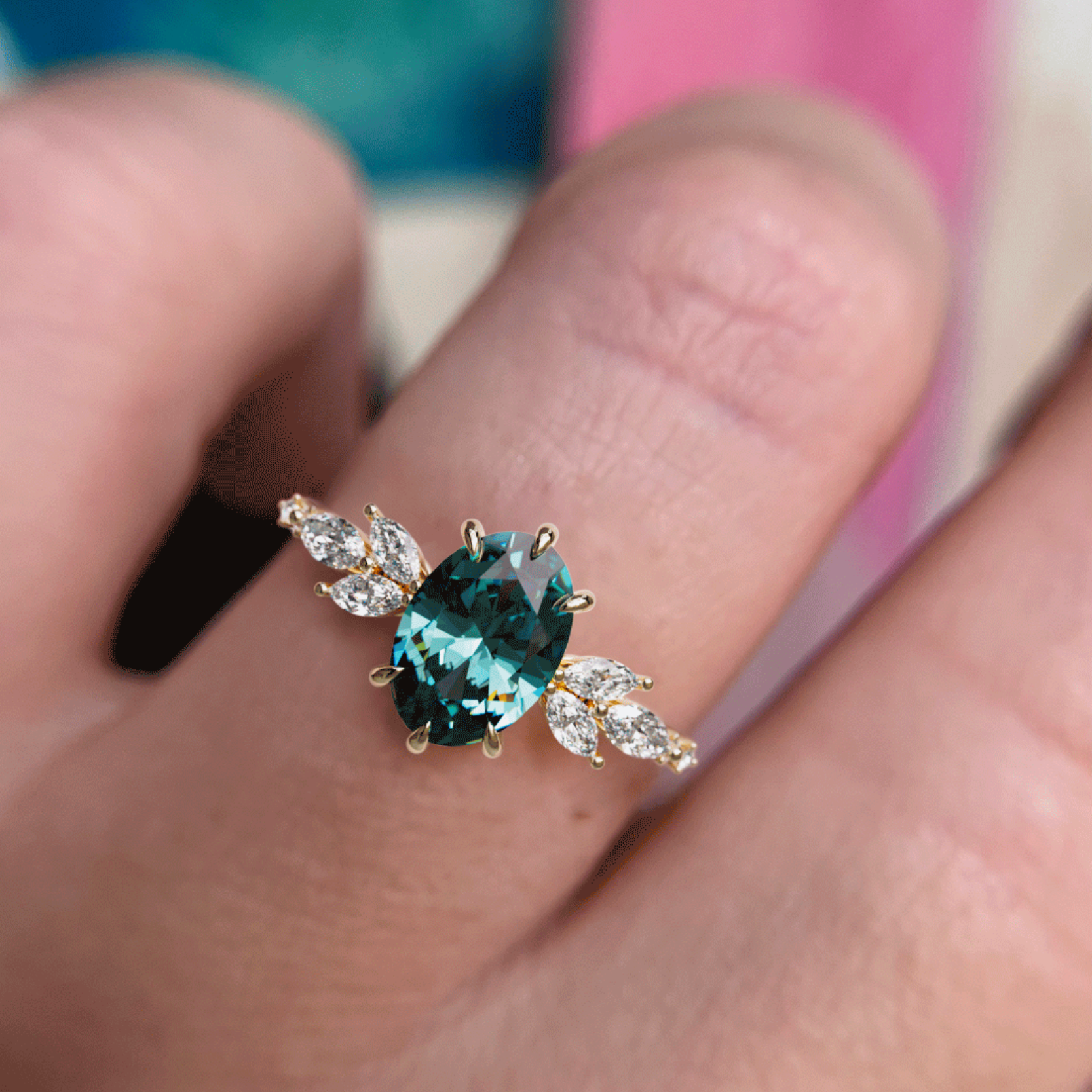 The Calla is a unique ring for hopeless romantics. Inspired by the beauty of flowers a oval teal sapphire takes center stage accented by a blossom of marquise diamonds. The Calla makes the perfect nature inspired engagement ring for those that feel connected to mother earth. Side lab diamonds are .39 total in grades of G+ VS1+.