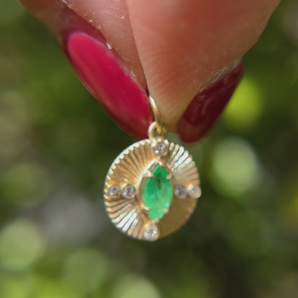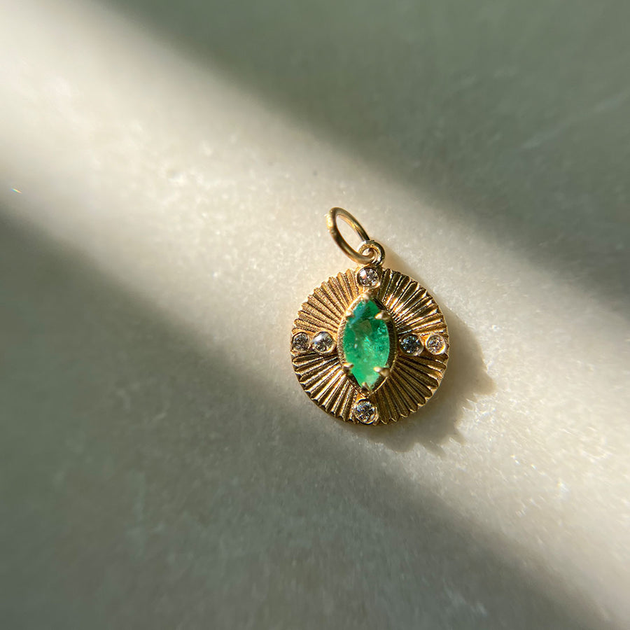 The Mini Damona charm is a fluted coin shaped pendant that features a center marquise cut emerald and accenting bezel set diamonds. Inspired by ancient treasure and compasses this charm mixes modern and vintage details for a unique symbolic heirloom piece. Center marquise emerald measures 6mmx3mm and diamonds measure 1.3mm, 1.2mm, and 1mm for a total diamond carat weight of .04 Cts.