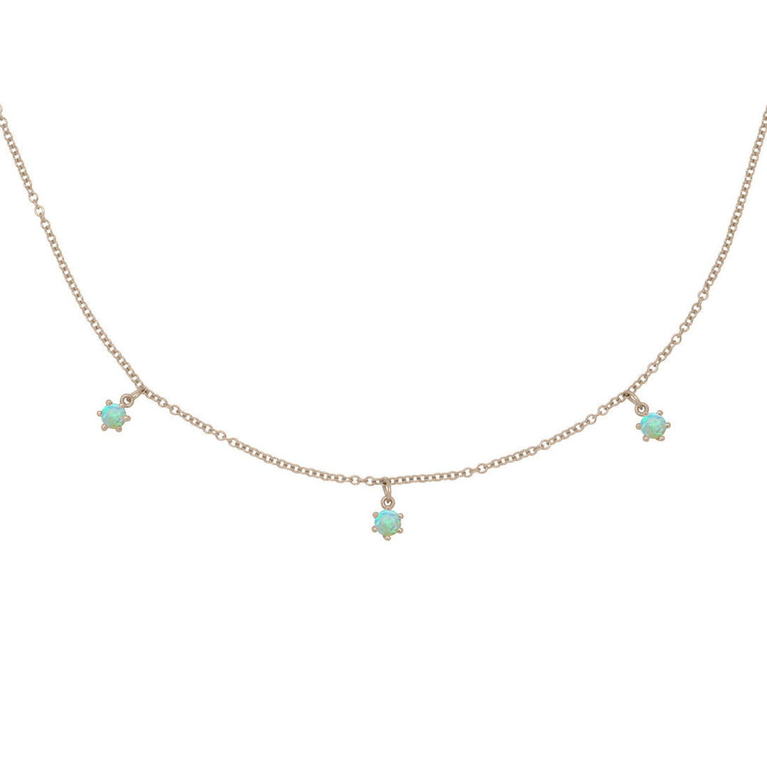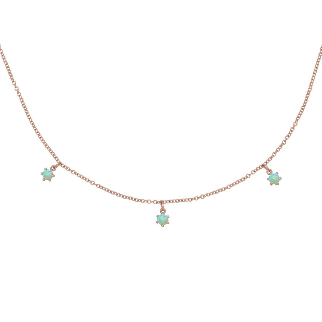 Ethical Australian Opals adorn a delicate chain inspired by legends of opals. The opal charms have beautiful movement and rainbow flash. The chain length 18" total. Stones are 3mm wide opal cabochons. Opals are AAA top-grade carefully selected for their rainbow flash and are ethically sourced. The chain is certified fairmined in yellow gold only. Rose gold and white gold chains are conventional gold. All charms are casted in certified fairmined yellow, rose or white gold.