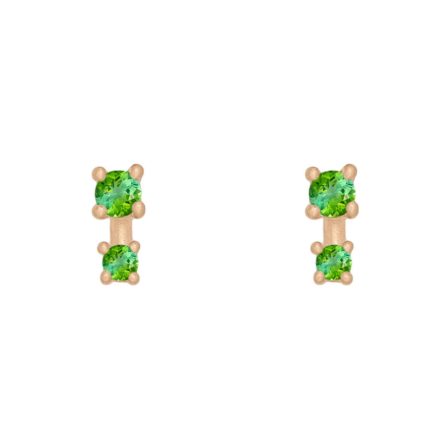 The Alula earrings are a classic staple. Two green tourmalines are set in fairmined gold for a bold sparkle. Perfect everyday earrings to mix and match in any piercing. Looks amazing with our other hoops and ear climbers and gives the illusion of a double pierced look. Tourmalines measure .03cts, .06cts, total for single is .09cts, and pair is .18cts.