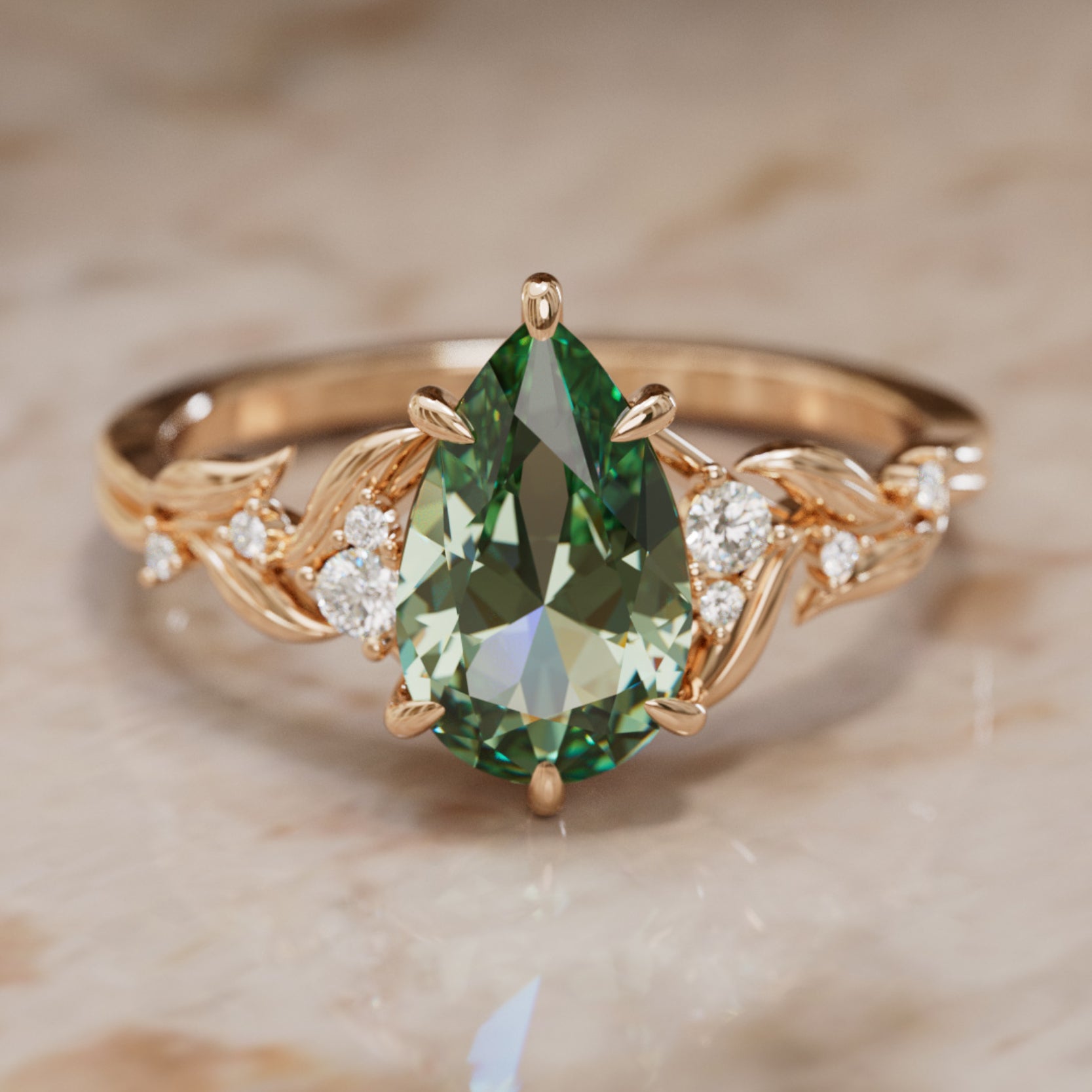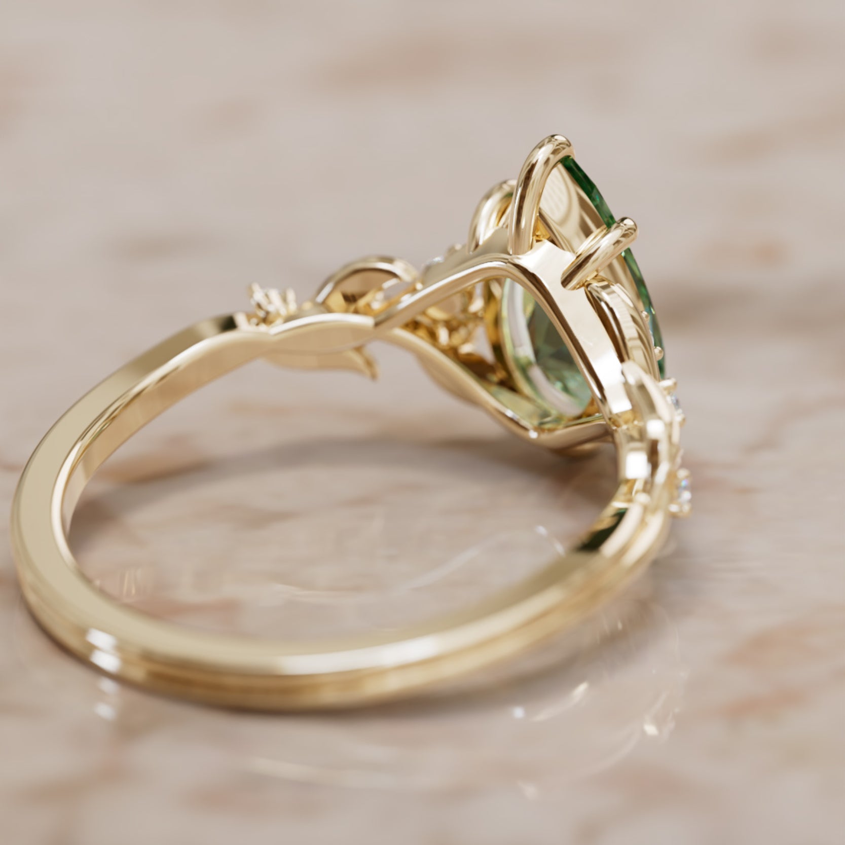 An art noveau fairytale, this nature inspired engagement ring is designed with elegant leaf patterns and diamond accents. A stunning Pear Cut Green Sapphire takes center stage, and is perfectly accented by fantastical details for a truly romantic engagement ring setting. Flattering and unique the Celria ring will make any proposal unforgettable. Center stone size in example is around 1.5cts. Side lab diamonds are .08 ct total and VS1+ quality.