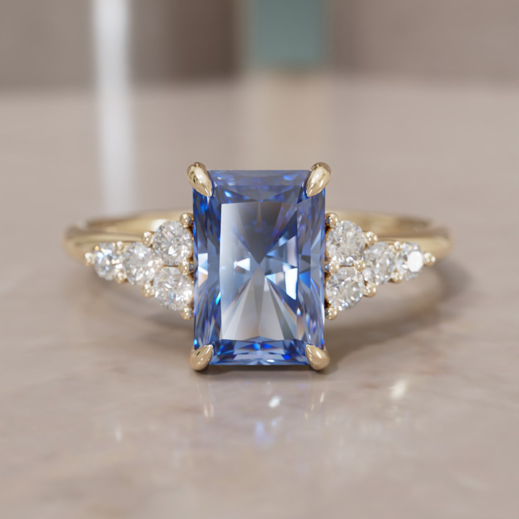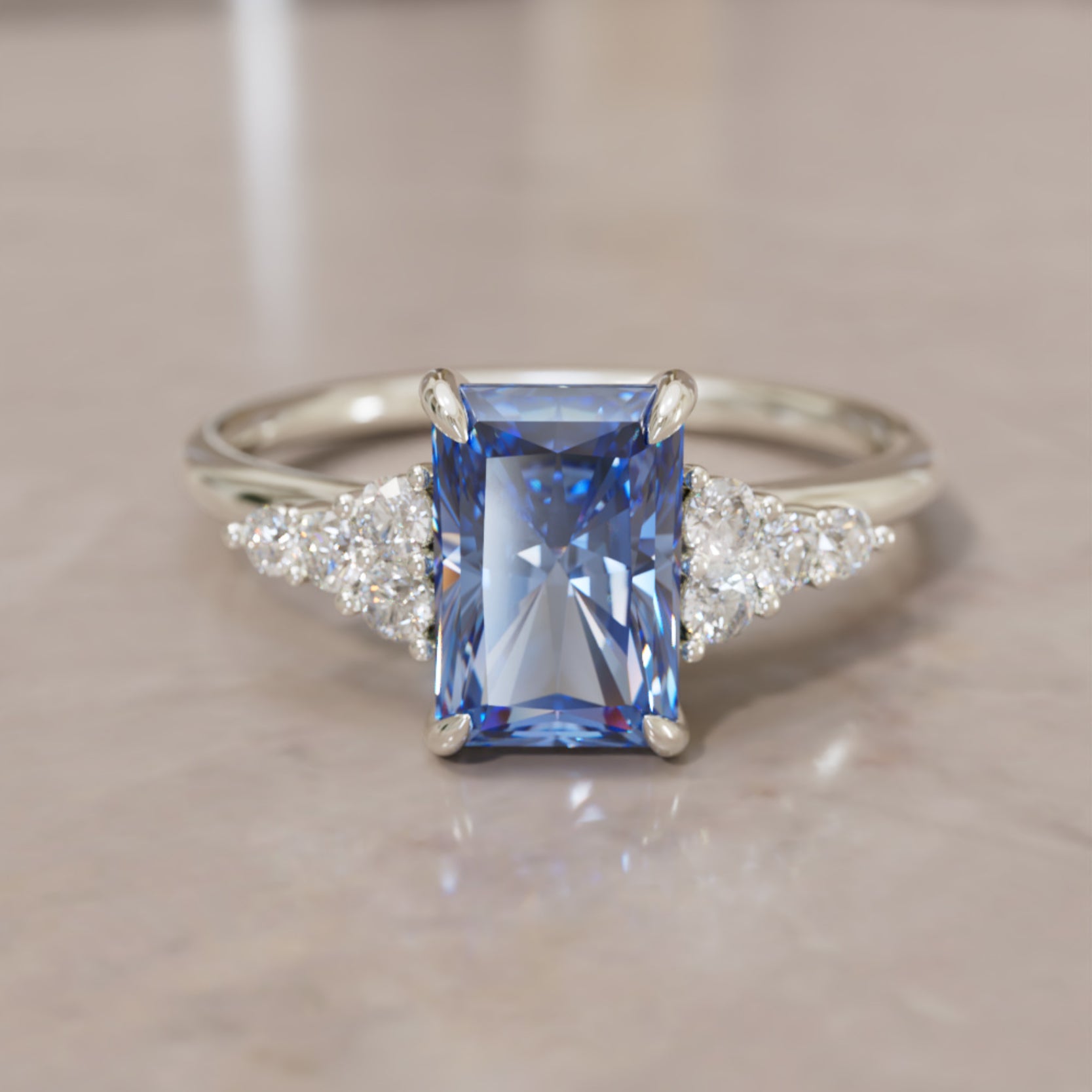 The Rohdea engagement ring is an elegant nature inspired design with tapered clusters of side diamonds. This unique engagement ring features an ethical radiant cut blue sapphire with prong settings and beautiful accenting diamonds that create a unique flattering silhouette.