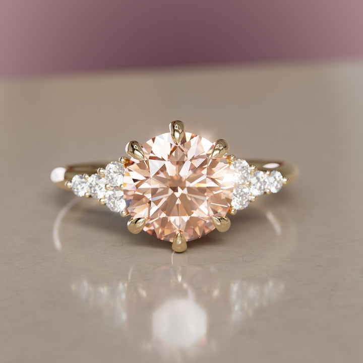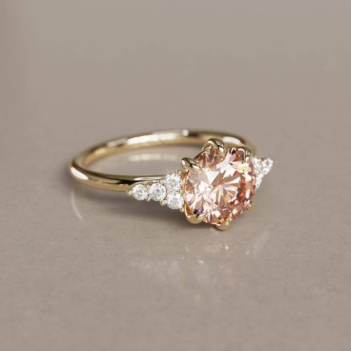 The Iris engagement ring is an elegant nature inspired design with tapered clusters of side diamonds. This modern style ring features an ethically sourced round peach lab diamond in the center with a beautiful taper accenting diamonds that create a unique flattering silhouette.