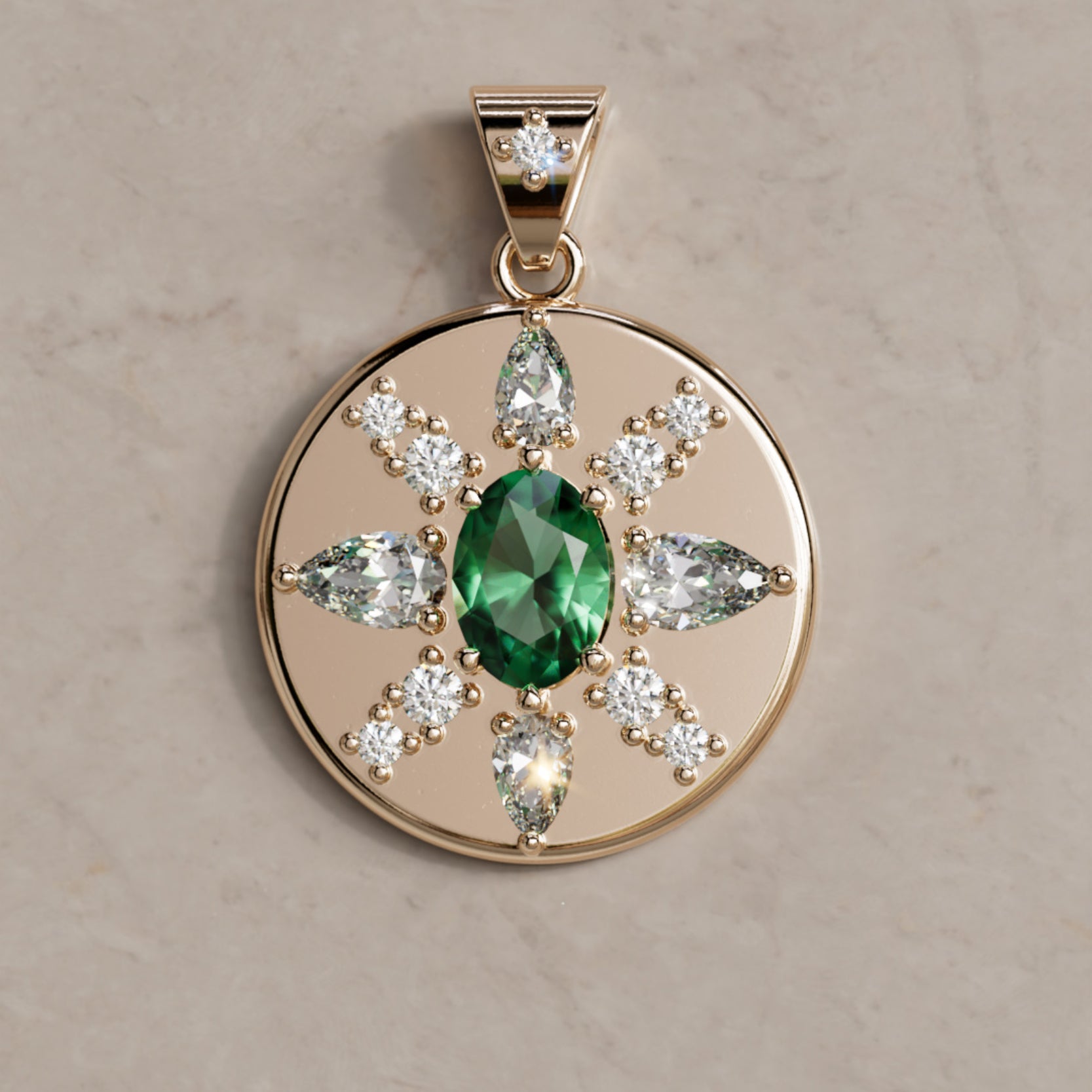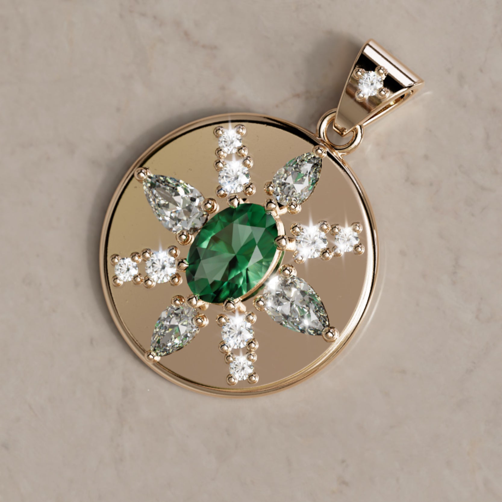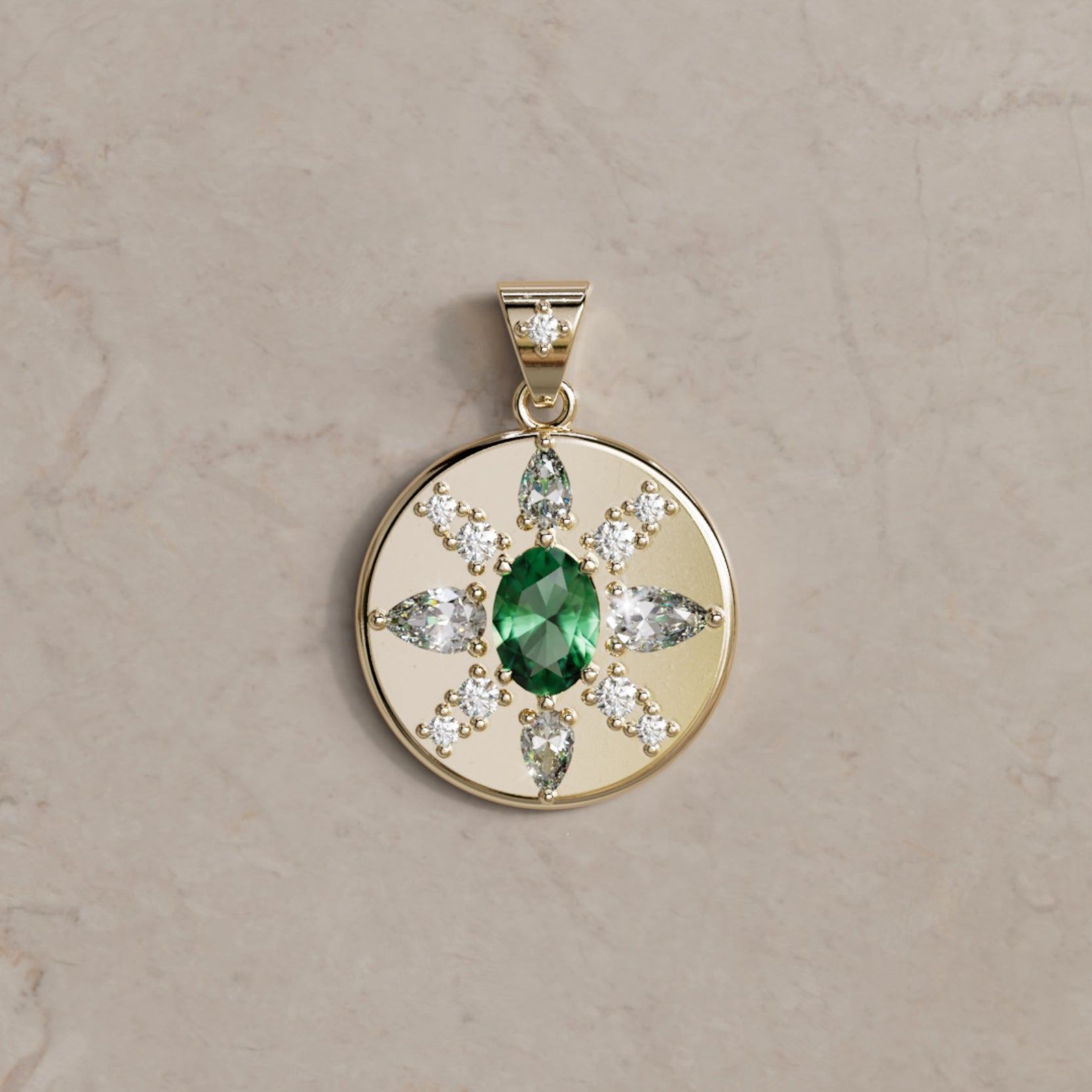 Step into paradise with the Arcadia Pendant. This stunning piece features a beautiful coin charm pendant set with a green oval cut emerald and pear cut lab diamonds. Inspired by the mystery of ancient jewelry this enchanting coin charm is sure to wow. Charm is 18mm wide. Center emerald is 4.5mmx6.5mm, and diamonds are 4mmx2mm, 5mmx3mm, 2mm, and 1.5mm. Total diamond carat weight is: .78 Cts. Pictured with a 1.6mm 18" fairmined gold cable chain (sold separately).