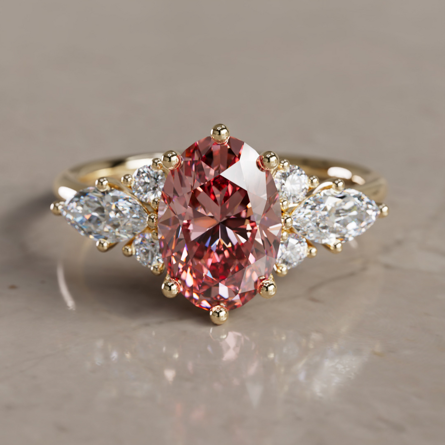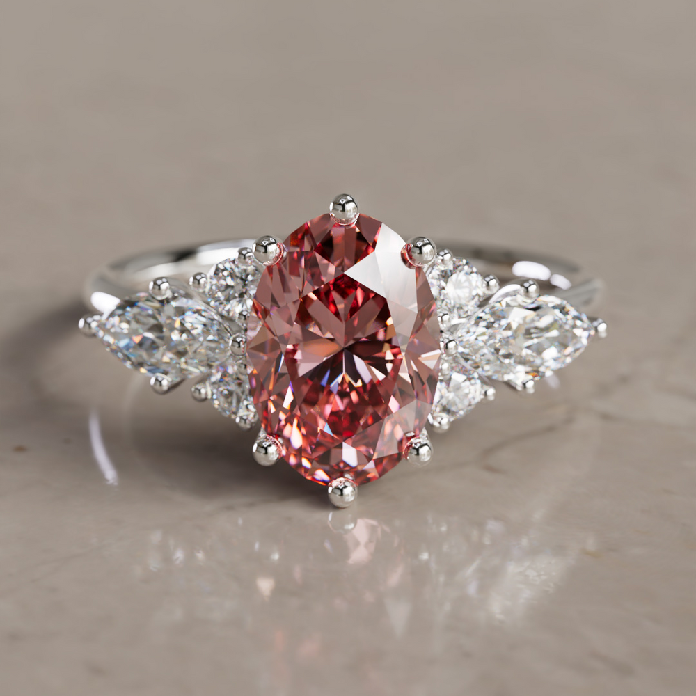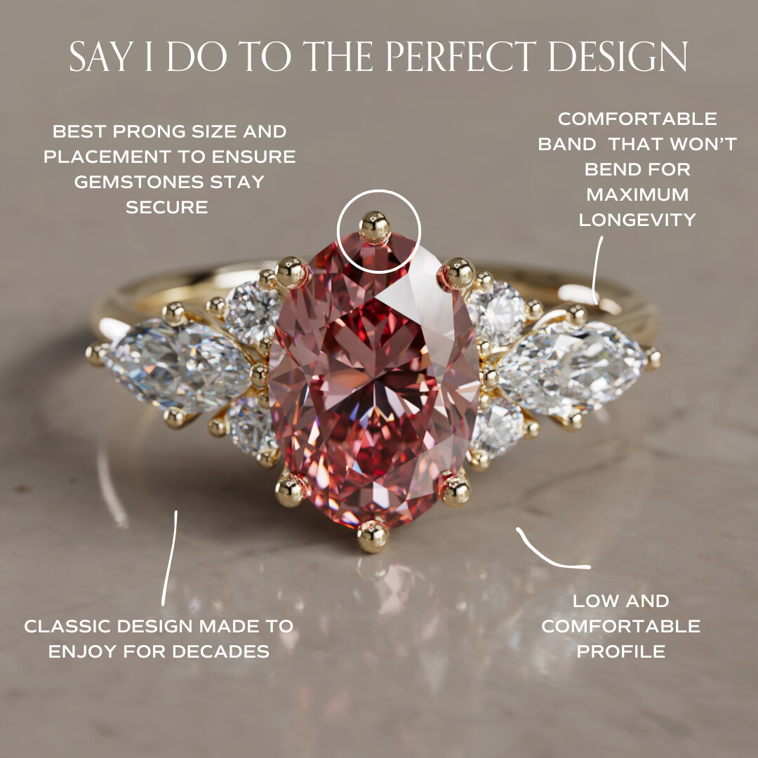 Introducing the Leonora engagement ring, a unique oval pink lab diamond ring inspired by romance and fairytales. This fairytale style ring is ethically made with the highest quality materials and features a unique oval cut pink lab diamond, accented by marquise cut lab diamonds to create a whimsical silhouette. Center lab diamond is 1.5 cts and  Side marquise lab diamonds are 6mmx3mm .25 cts each, and round cut side lab diamonds are 2mm .03cts each. Total lab diamond carat weight for the stunning Leonora ring is 2.18 Cts.