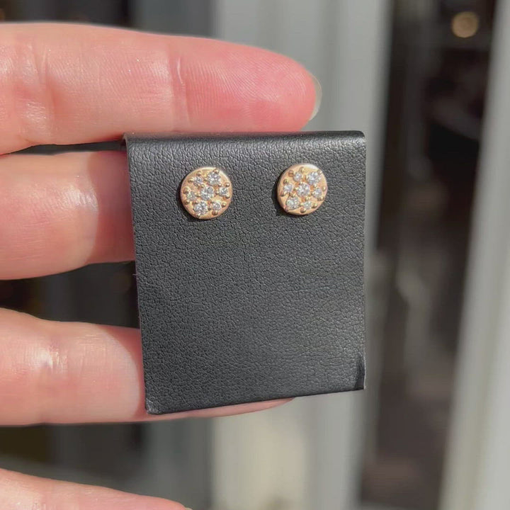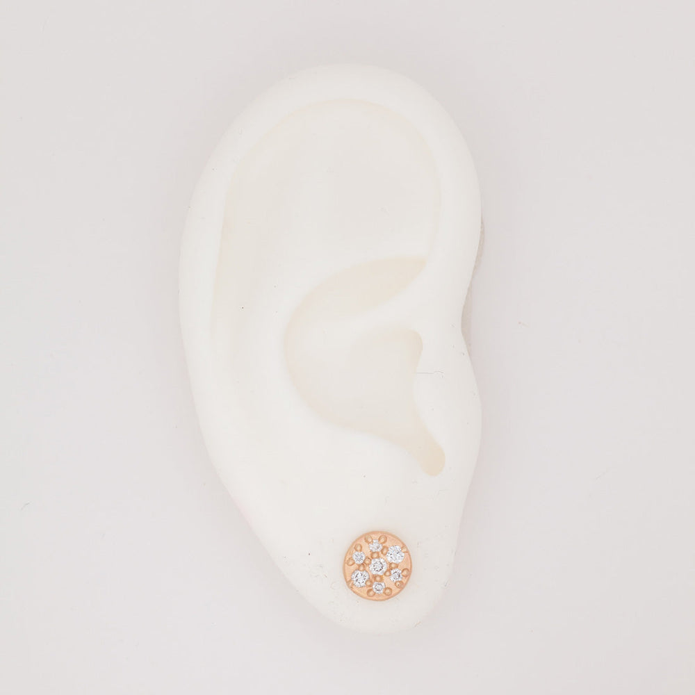The mini helios stud earrings are a classic disk shape reminiscent of ancient Roman jewelry. Studded with ethically sourced diamonds and given a rustic finish.