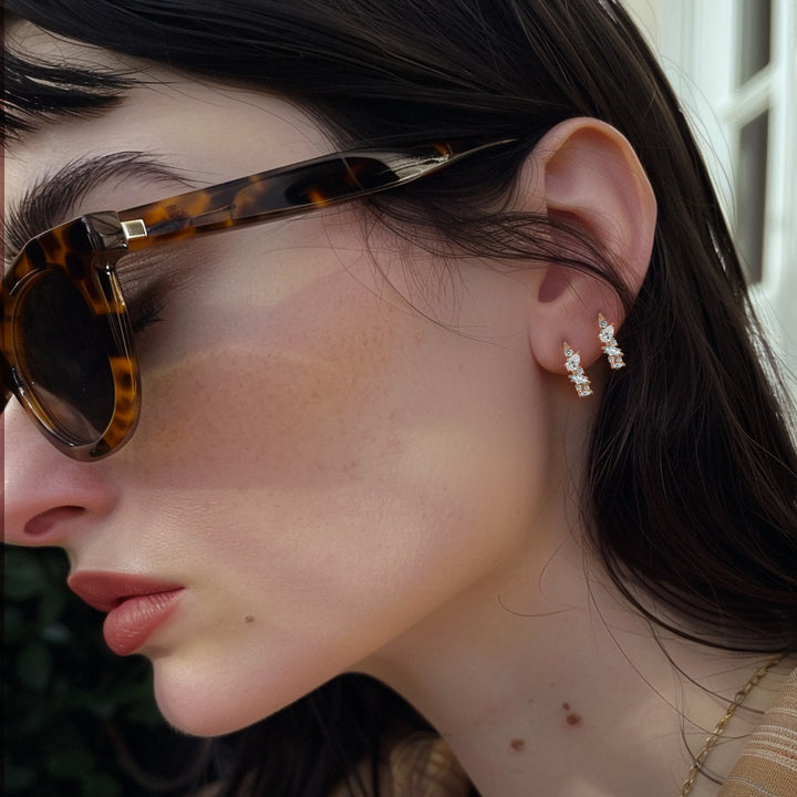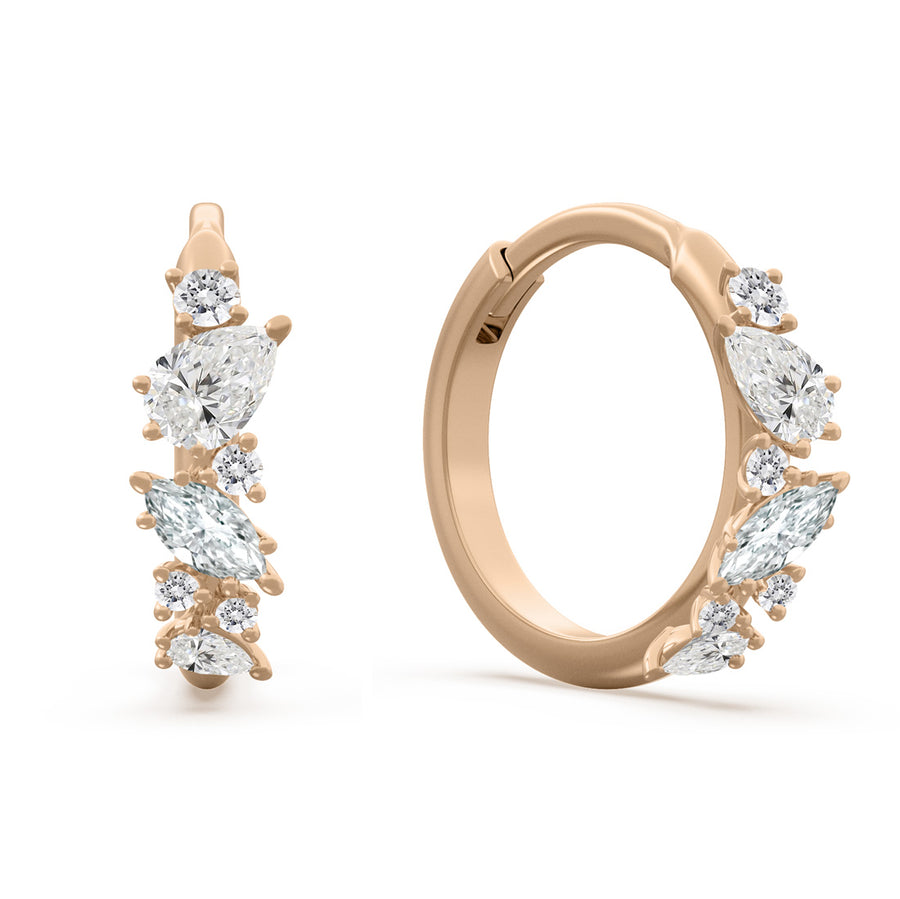 The Mélange clicker hoops are an elegant every day staple and feature a mixed collage design of pear, marquise and round shape diamonds set along the edge of a modern 14k gold clicker hoop. These earrings fasten with a hinge clicker closure. For a seamless hoop from all angles, clickers make for the easiest earring to wear everyday. Total diamond carat weight for the pair is .32 Cts. Interior of hoop measures about 12mm for the perfect hoop earring look.