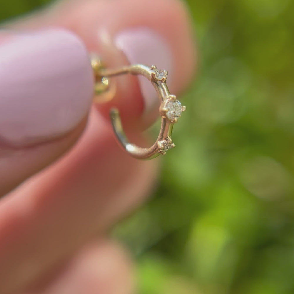 The Orion the Hunter constellation is one of the most distinct star arrangements in the night sky. The three beautiful stars that outline the Hunter's belt was the inspiration for the Orion's Belt Mini Hoops. Diamonds are carefully set into satin fairmined gold to give the earrings a romantic look. Size: 8mm wide. Backing: Secures on your ears with posts and butterfly backs. Total diamond carat weight is .12 Carats.