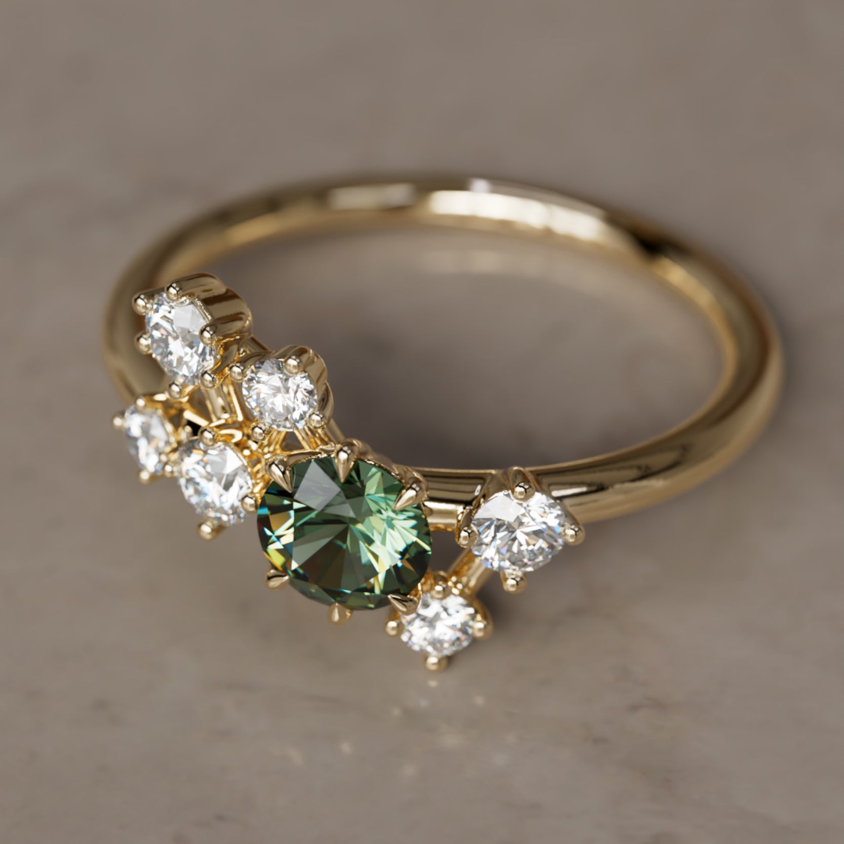 Introducing the Andromeda Sapphire Ring, an ethereal masterpiece inspired by the Andromeda galaxy. This celestial cluster ring features lab-grown diamonds arranged in a captivating celestial shape, with a mesmerizing 4.5mm green at its center. Elevate your style and embrace the beauty of the cosmos with this unique and enchanting piece.
