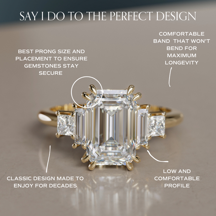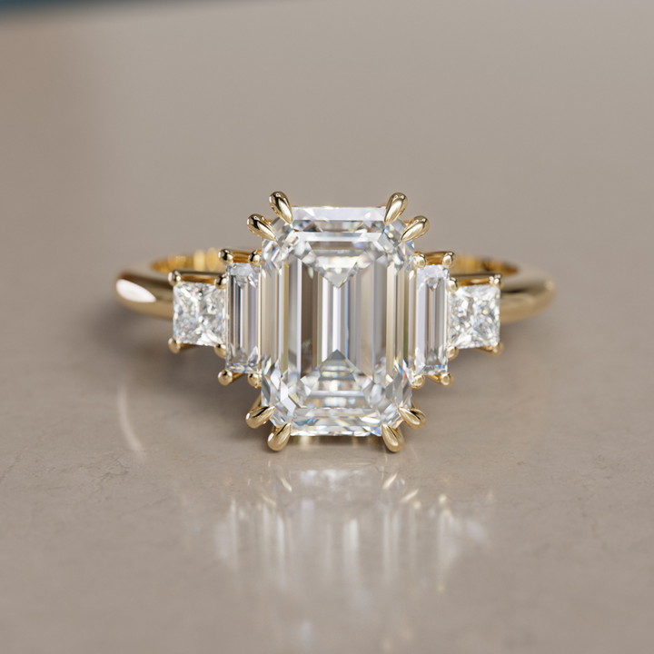 The Christy Ring, is a modern five stone engagement ring featuring a center emerald cut lab created diamond accented by baguette cut and princess cut lab diamonds. The custom sourced emerald cut sapphire takes center stage and is artfully set on a minimalist D shape gold band with secure prongs. Side stones measure .25ct total. Stone pictured in example is about 2 Cts.