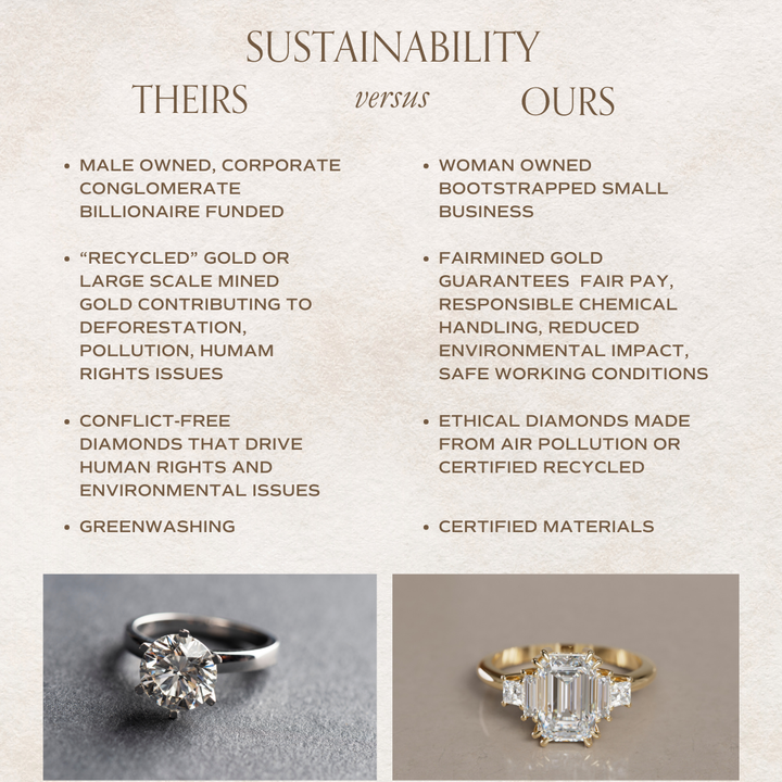 We offer a variety of alternative ethical gemstones like artisanally mined, certified recycled, lab grown, SCS Sustainably Rated diamonds, and lab grown diamonds made from air pollution. We continue to audit and improve upon our supply chain as the industry evolves. We are forging relationships with suppliers that are working directly with the miners and cutters and improving the industry for the better.