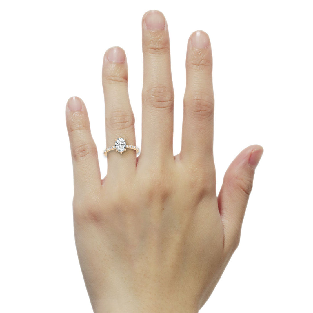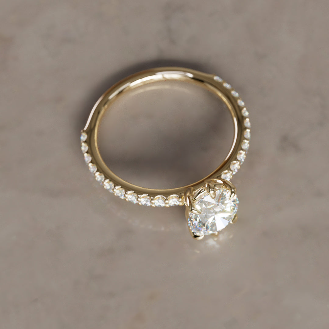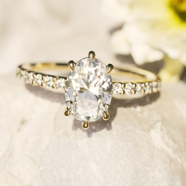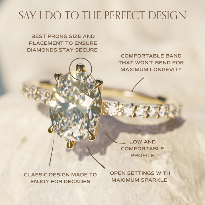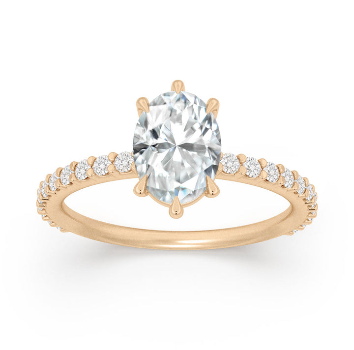Introducing the Cybele Engagement Ring, a true symbol of love and ethical elegance. This exquisite piece features a stunning oval cut diamond solitaire nestled in a classic prong setting. The pavé band, adorned with 1.5mm/.015ct diamonds, sparkles from every angle, adding a touch of glamour to this timeless design. Crafted from ethical metals, the band measures 1.7mm wide, ensuring both style and durability. What sets this ring apart is the option to choose your exact stone, making it a truly personalized piece. Embrace the beauty of a conflict-free and sustainable engagement ring with the Cybele. Order now and let your love story shine ethically.