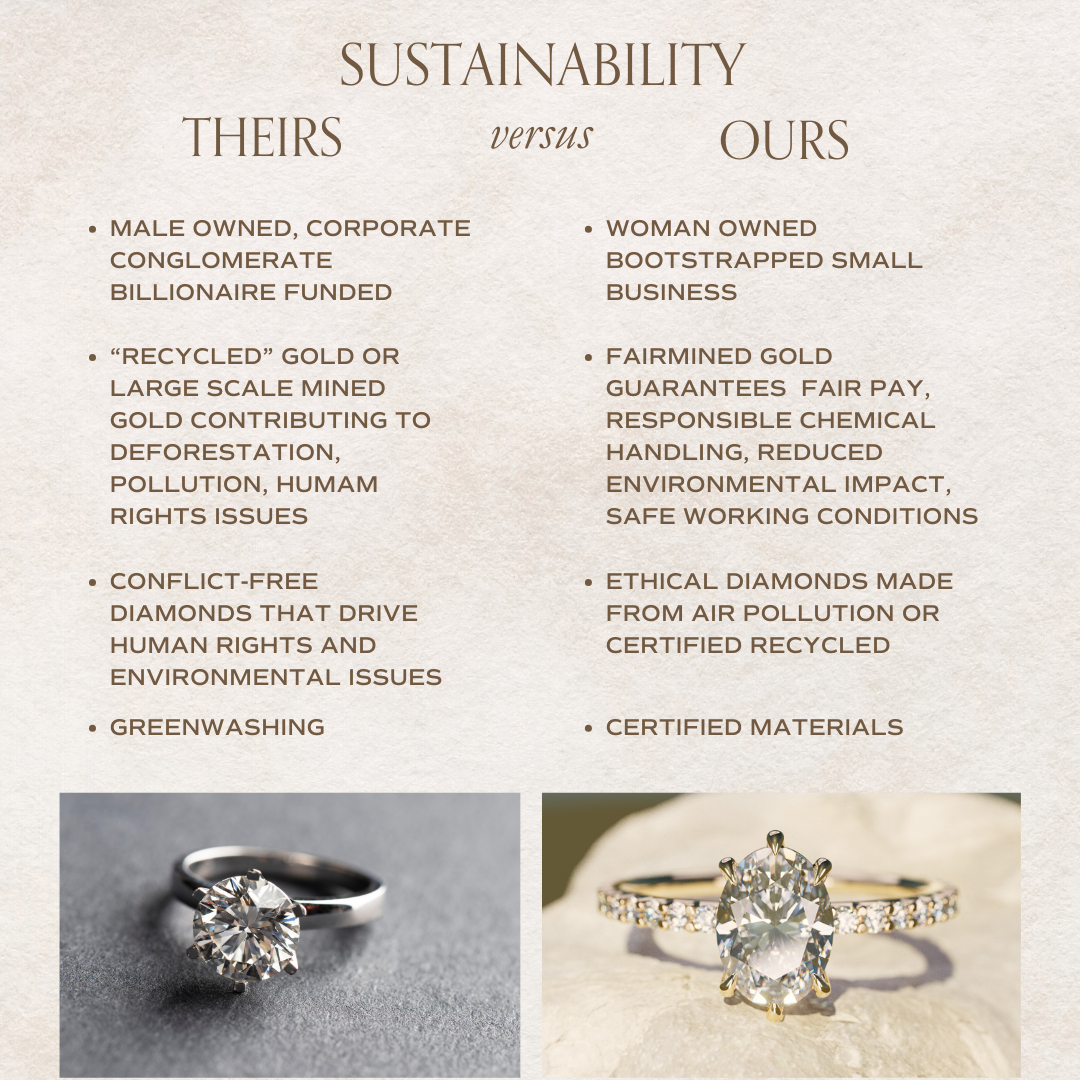 We offer a variety of alternative ethical gemstones like artisanally mined, certified recycled, lab grown, SCS Sustainably Rated diamonds, and lab grown diamonds made from air pollution. We continue to audit and improve upon our supply chain as the industry evolves. We are forging relationships with suppliers that are working directly with the miners and cutters and improving the industry for the better.