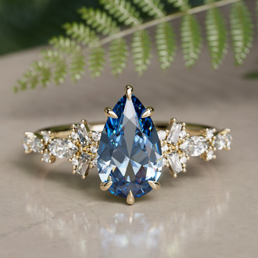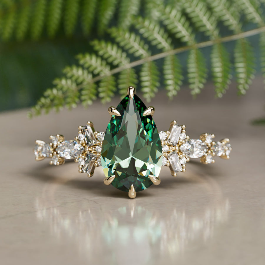 A unique diamond studded split shank design creates a delicate floating frame for a romantic central pear cut teal sapphire. The Presley engagement ring is equal parts flattering and equal parts chic and inspires timeless elegance with its captivating scintillation. Side lab diamonds are .14 carats total in grades of G+ VS1+.