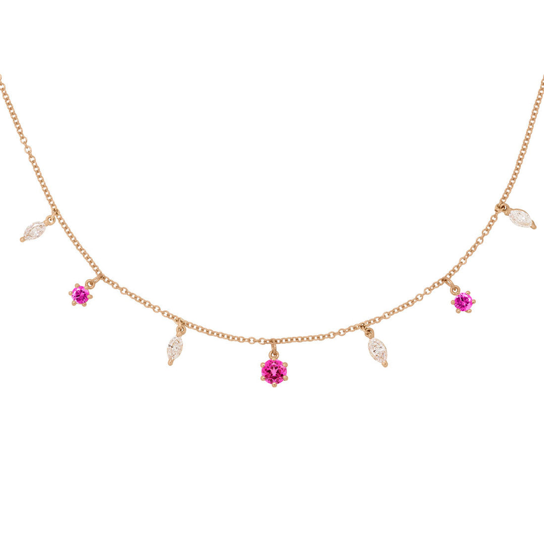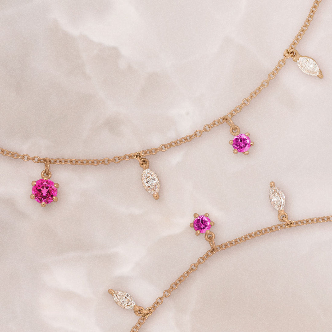 Ethical Vietnamese Rubies and Marquise cut diamonds adorn a delicate chain. The charms have beautiful movement and sparkle. The chain length 18" total. Center ruby stone is .25 cts, smaller ruby stones are .1 Cts, .45 Cts in total rubies. Stones are top-grade Vietnamese rubies with a deep rich color that are ethically sourced. Marquise lab diamonds are .10 cts, total .5 cts. The chain is certified fairmined in yellow gold only. Rose gold and white gold chains are conventional gold. All charms are casted in certified fairmined yellow, rose or white gold.