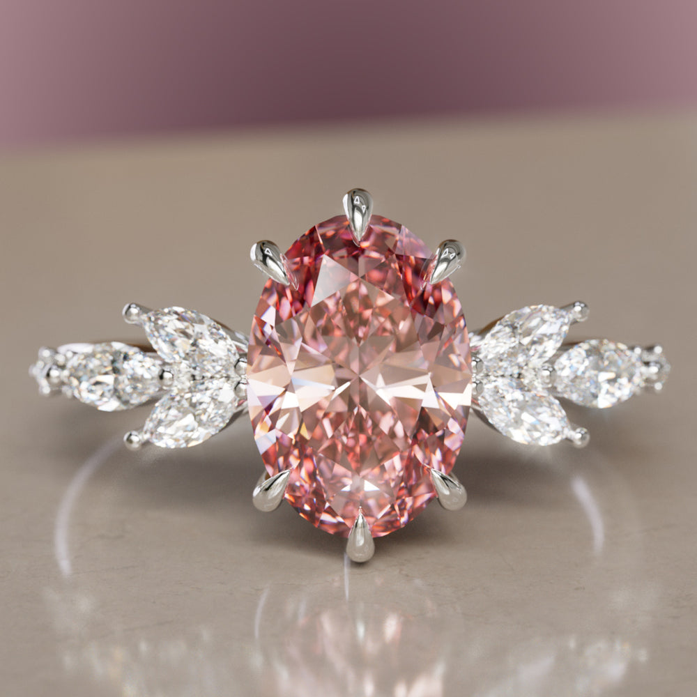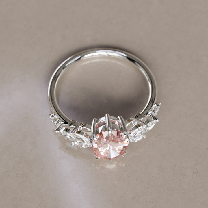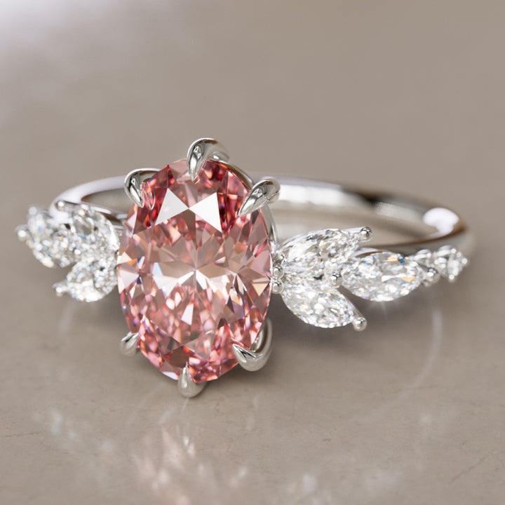 El Calla es un anillo único para románticos empedernidos. Inspirado en la belleza de las flores, un diamante ovalado rosa toma el centro del escenario acentuado por un racimo de diamantes marquesa. La Calla es el anillo de compromiso perfecto inspirado en la naturaleza para quienes se sienten conectados con la madre tierra. Los diamantes laterales de laboratorio son 0.39 en total con grados de G+ VS1+.