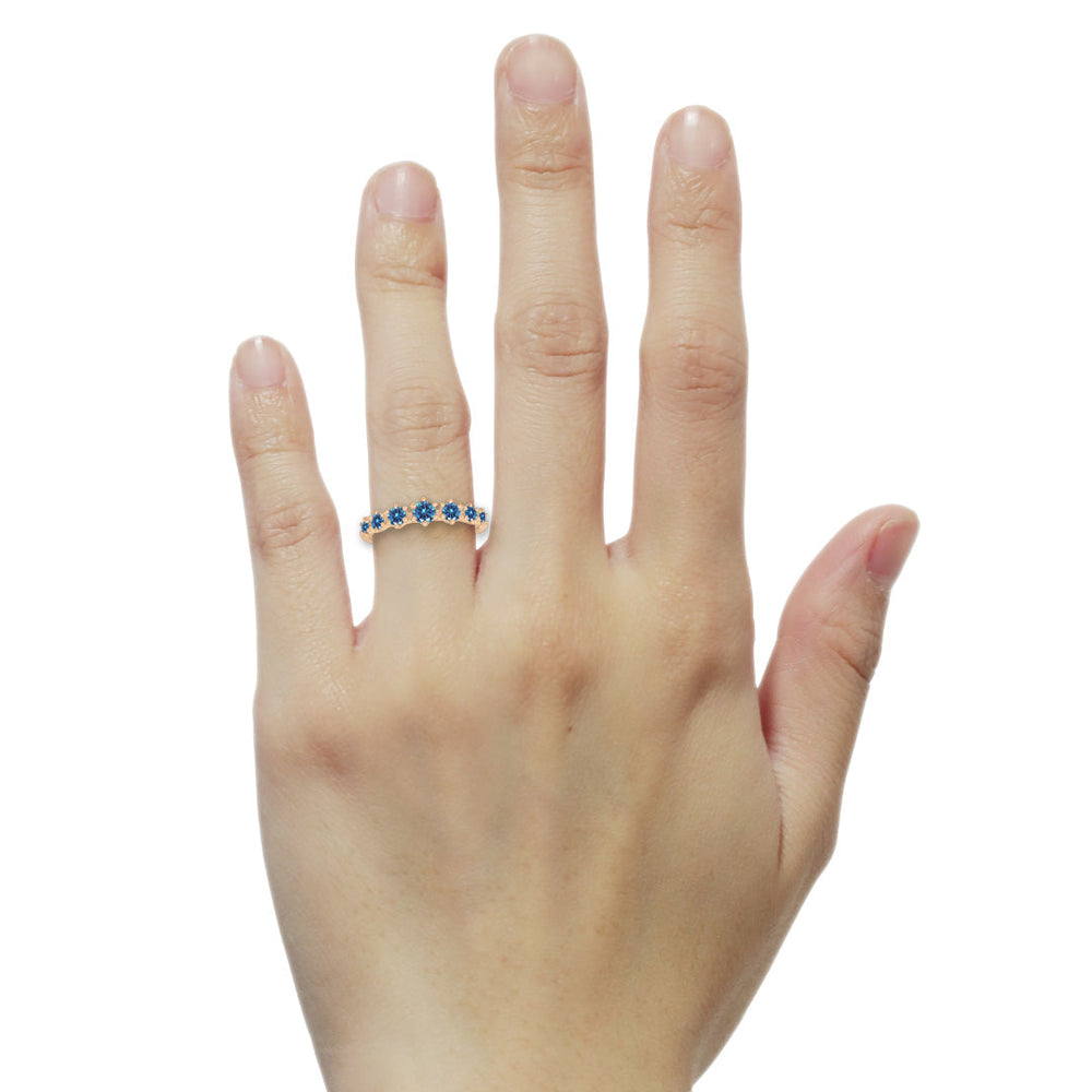 Una audaz alianza semi-eternidad cónica, el anillo Helena presenta 0.55 ct de zafiros que están engastados a mano con 6 garras orgánicas. La piedra central es de 0.17 ct. La banda redonda tiene 1.6 mm de ancho, peso total de oro 2.44 gramos.