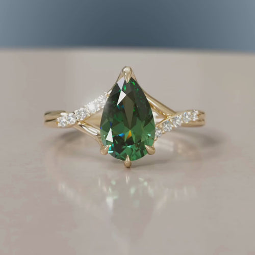 Enamórate del encantador Anillo Faye. Inspirado en cuentos de hadas y romances atemporales, este anillo cruzado de banda partida presenta un impresionante zafiro verde central en corte pera, acompañado de una delicada banda pavé adornada con diamantes melee.