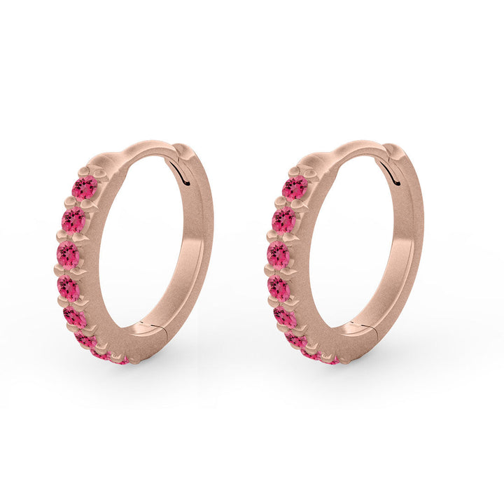 Tapaa täydelliset jokapäiväiset korvakorusi: Paola Clicker Hoops. Nämä saumattomat renkaat sisältävät 1,5 mm (0,015 ct) vaaleanpunaisia turmaliineja ikuisuusasetuksessa, varustettuna kätevällä saranalla ja napsautuslukolla. Suunniteltu jokapäiväiseen käyttöön, nämä korvakorut tarjoavat saumattoman ilmeen kaikista kulmista. Valitse yksittäiset tai pari vaaleanpunaisilla turmaliineilla. Nosta korvakorupelisi uudelle tasolle Paola Clicker Hoops -korvakoruilla. Sisähalkaisija on 10 mm. Yhden korvakorurenkaan kokonaiskaraattipaino on 0,12 ct ja parin 0,22 ct.