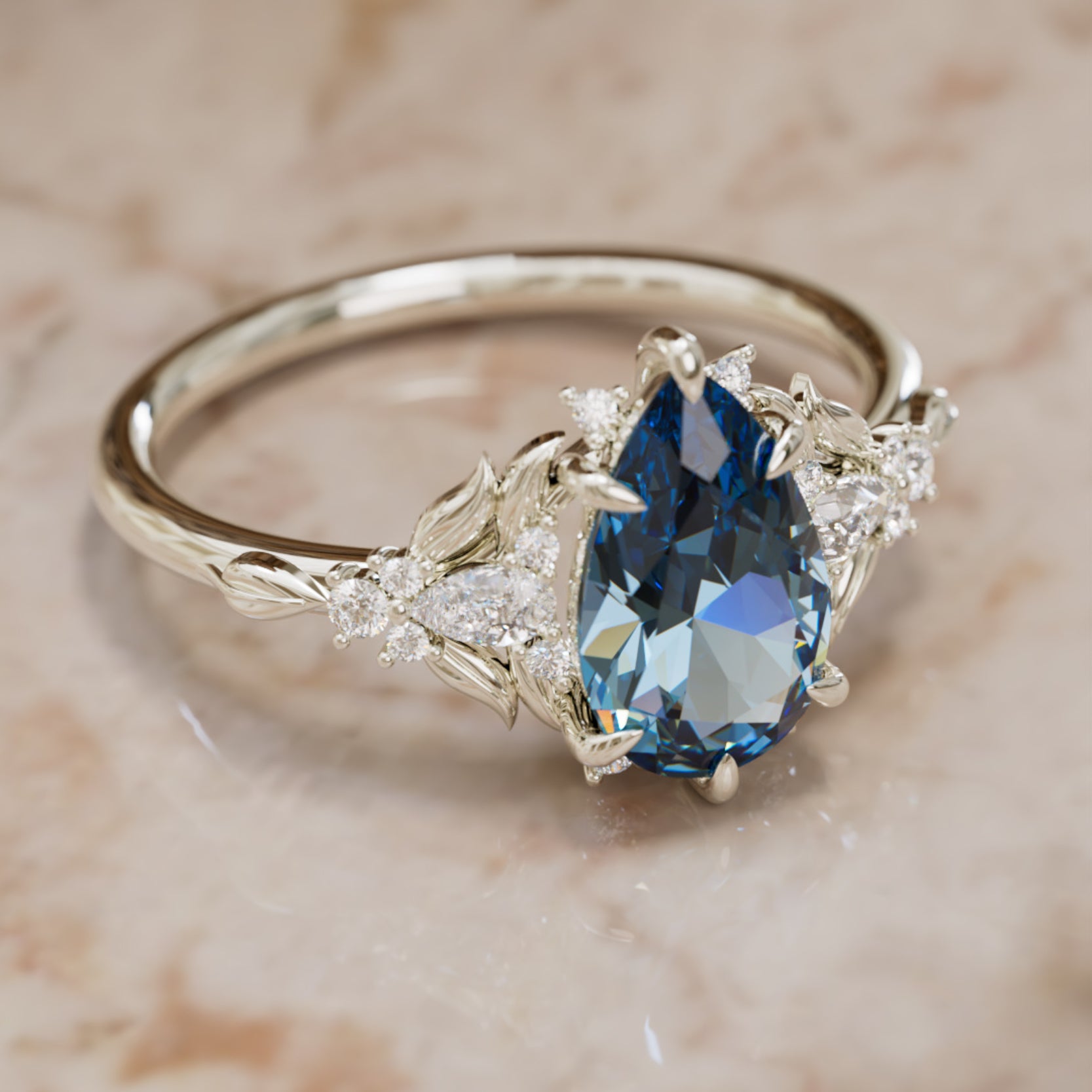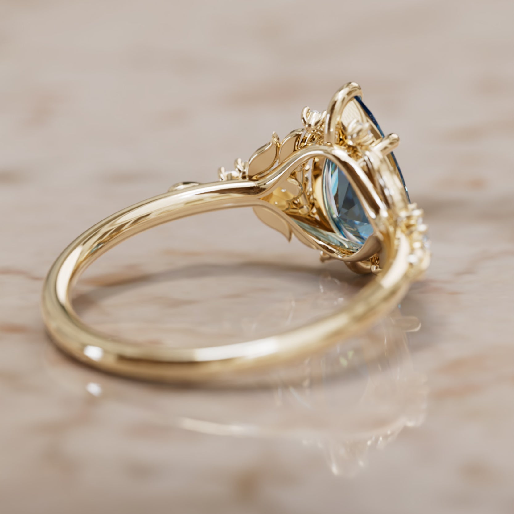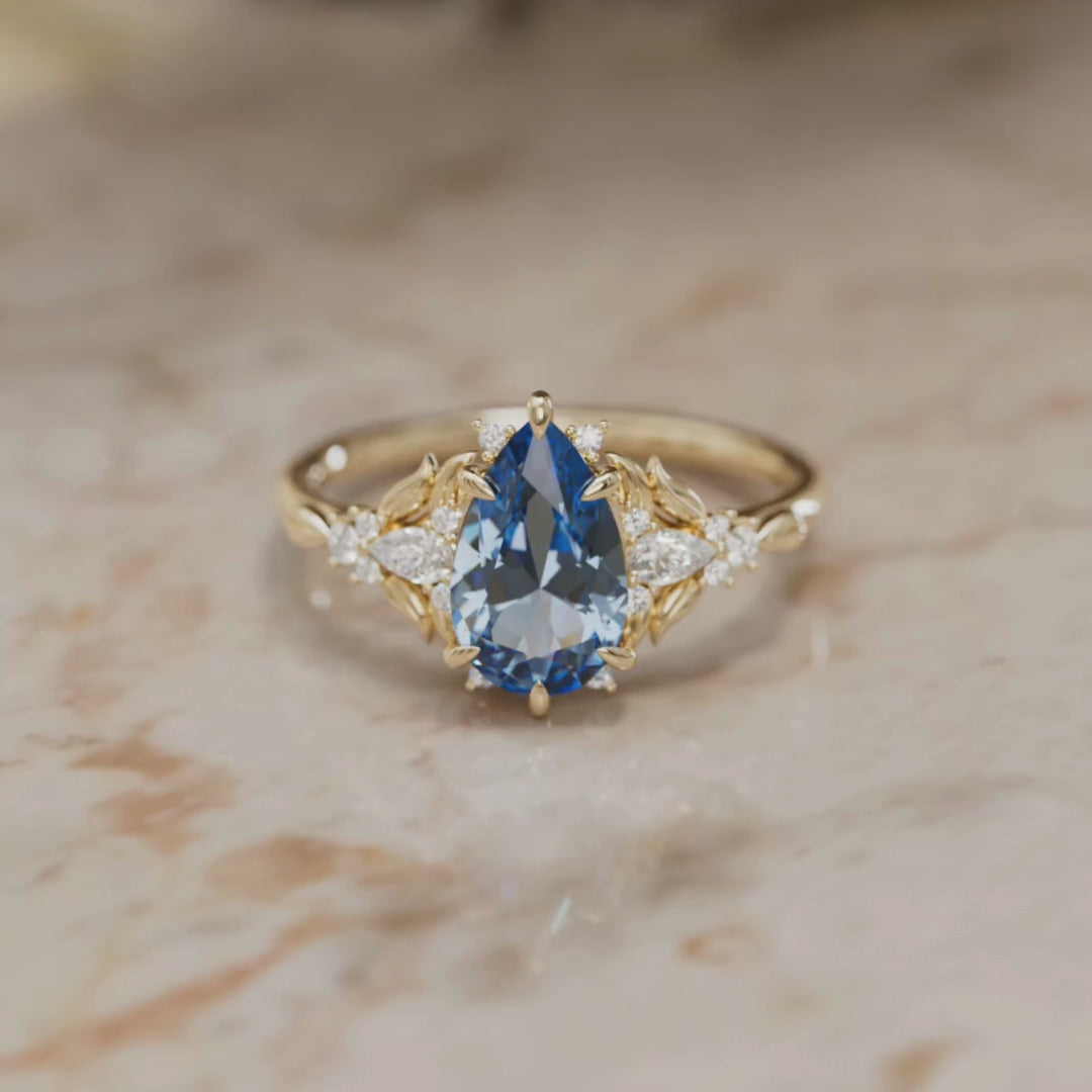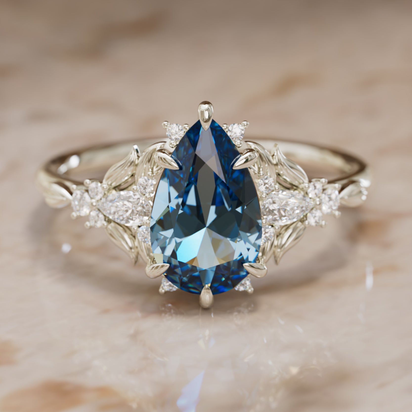 Sininen safiirisormus kihlasormukseksi: Siriwen päärynäleikkaus safiirikukkasormus luonnon inspiroima (vain sormuksen runko)
