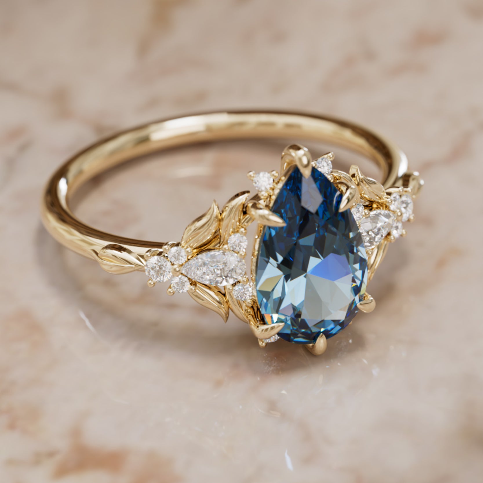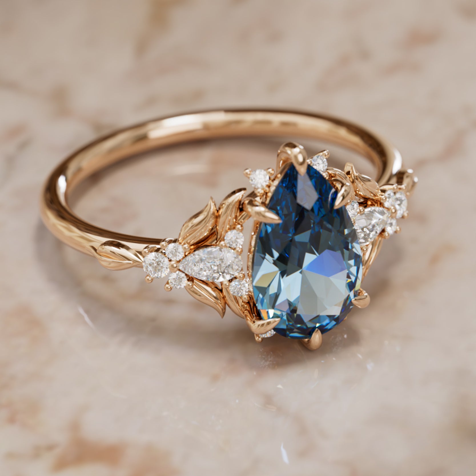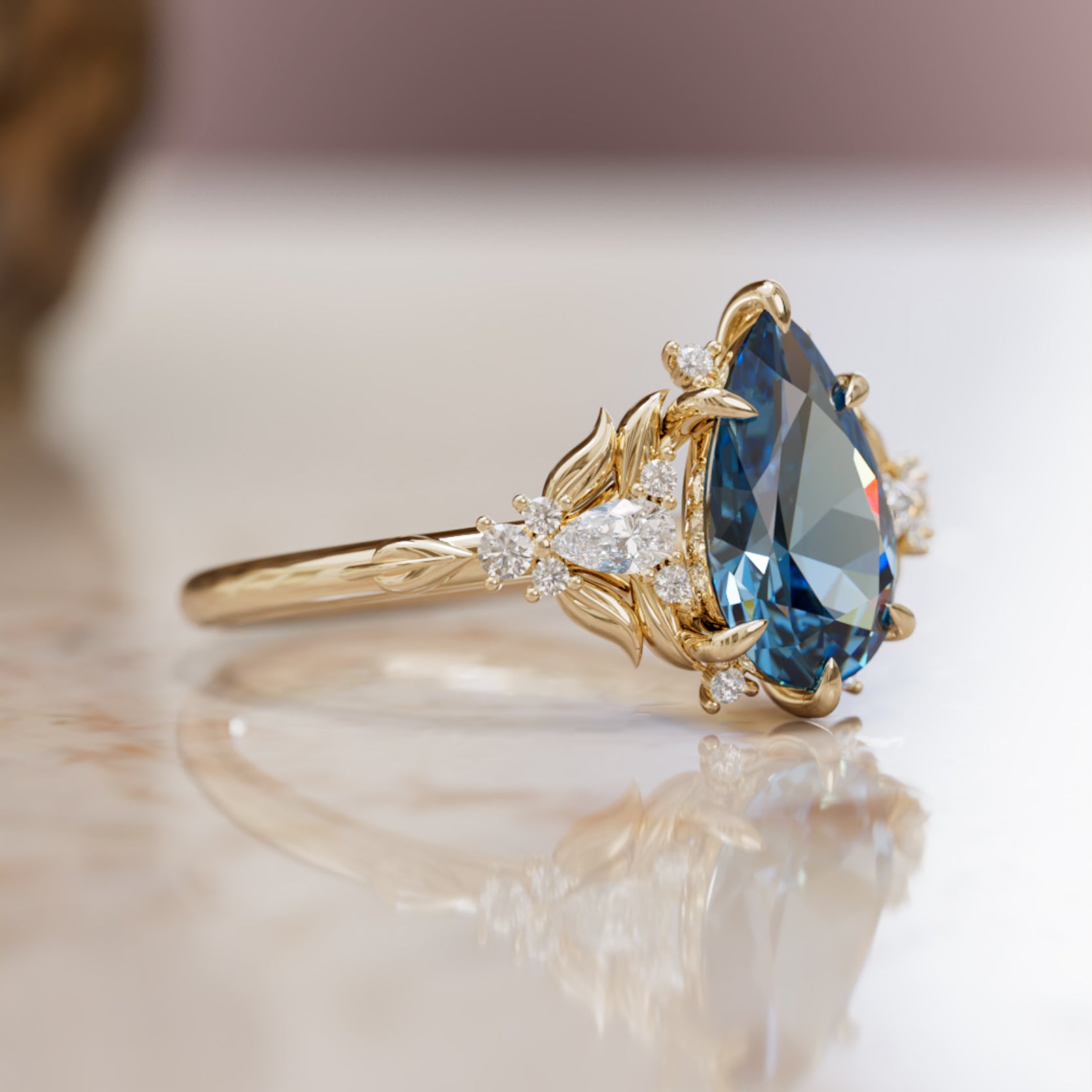 Sininen safiirisormus kihlasormukseksi: Siriwen päärynäleikkaus safiirikukkasormus luonnon inspiroima (vain sormuksen runko)