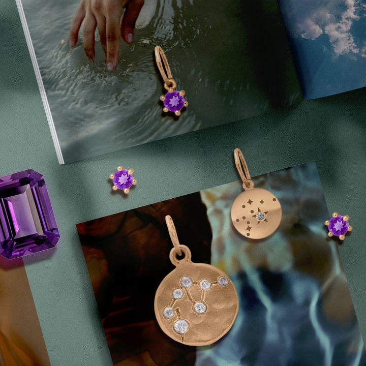 Jokainen 12 horoskooppikonstellaatioista on saatavilla kiinteästä 14k fairmined-kullasta ja korostettuna yhdellä hehkuvalla 1 mm laboratoriossa kasvatetulla timantilla. Horoskooppikonstellaatioiden tähtimotiivi on hienovaraisesti kaiverrettu riipukseen ja viimeistelty satiinipinnalla ultra ylellisen ilmeen saavuttamiseksi. Takana on kolme kaiverrusta horoskoopin symbolista, elementistä ja hallitsevasta planeetasta. Suunniteltu käytettäväksi yksin oman merkkisi kanssa tai kerättäväksi ja pinottavaksi rakkaidesi tähtimerkkien kanssa.